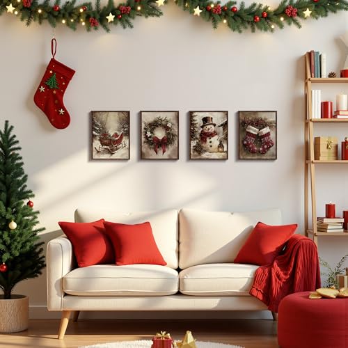 DOFQZ Vintage Christmas Wall Art Prints Set of 4, Rustic Red Christmas Decor, Farmhouse Holiday Winter Red Sleigh Stocking Wreath Snowman Posters for Home Living Room Bedroom Decor, 8x10 Unframed