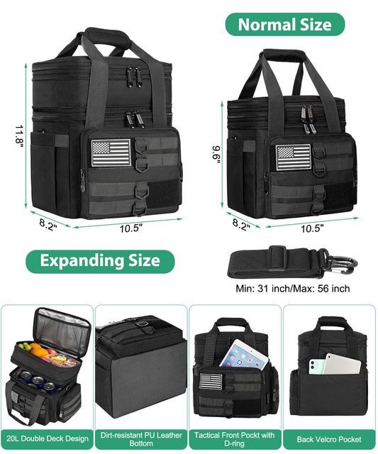 SumeStar Tactical Lunch Box for Men, Large Insulated Lunch Bag Adult, Heavy Duty Double Deck Expandable Lunch Cooler Bag Leakproof Waterproof Lunch Tote for Work Office Camping Travel - Black