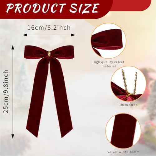12 Pieces Christmas Velvet Ribbon Bows for Tree Ornament, Rustic Crafts Wreath Bows for Gift Wrapping, Staircase, Stocking, Xmas Home Decor, 6.3 x 10 Inches (12, Wine Red)