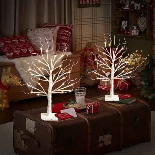 White Birch Tree with LED Lights, Christmas Decorations Lighted Tree for Tabletop, Battery Operated 24 LED Warm White Tree, 2FT Mini Small Christmas Tree Indoor Home Christmas Decor (2 Pack, Timer)
