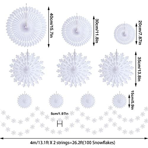 - WAHT YOU WILL GET:total 12 pieces.winter wonderland snowflake set includes:1pc 40cm/15.7inches hollow fan,3pcs 35cm/13.7inches snow fan,1pc 30cm/11.8inches hollow fan,1pcs 20cm/7.8inches hollow fan,4pcs 15cm/5.9inches snow fan,2 strings snowflake string (each snowflake diameters is 5cm/1.9inches, each string 50 pieces, 4 meters/157inches)