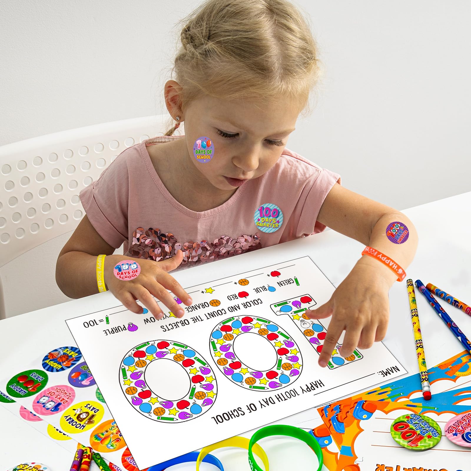 - Suitable Size: the 100th day of school certificate of awards measure about 21.6 x 14 cm/ 8.5 x 5.5 inches, the 100th day bracelets are about 6.3 cm/2.5 inches in diameter,coloring posters are 28x 21cm/11x 8.7inches,badges pins are 4.4 cm/1.73 inches in diameter,the 100th day stickers are about 4 cm/ 1.57 inches in diameter and the pencils are 19cm/7inch