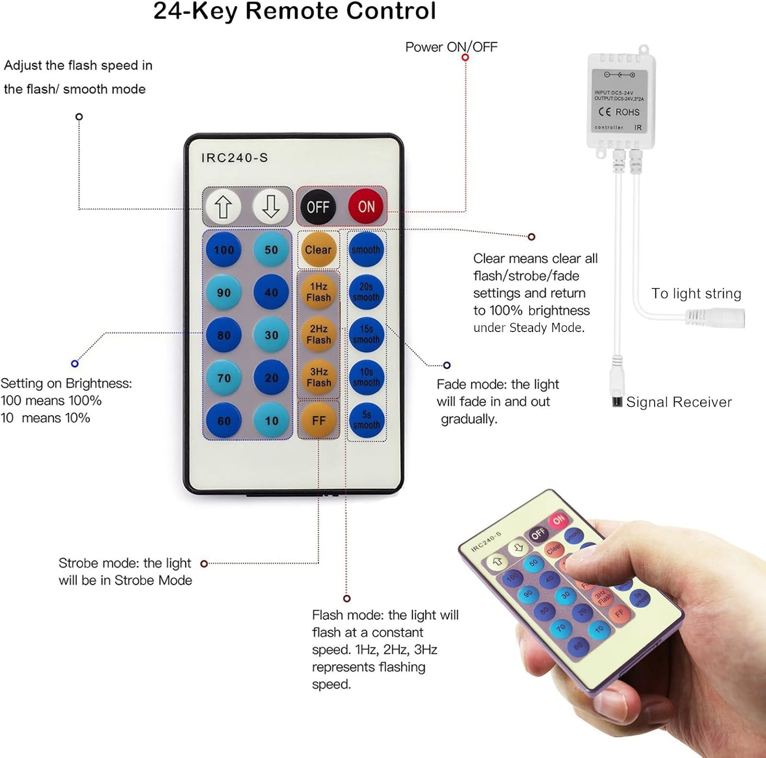 All modes work via the included 24-key remote control, you can adjust 10-level brightness, 3 options of lighting modes: Smooth/flash/Strobe, and the speed of the dynamic modes.