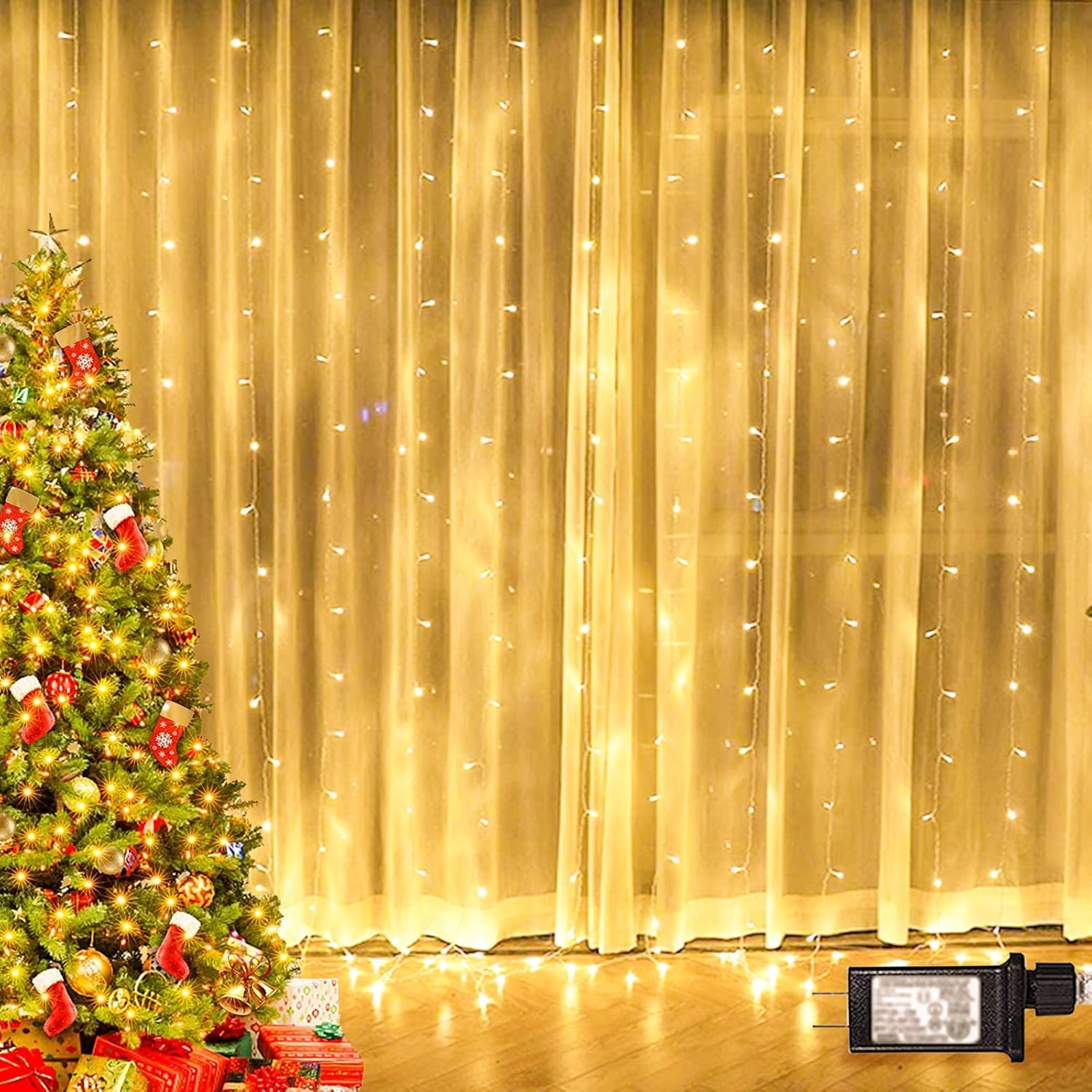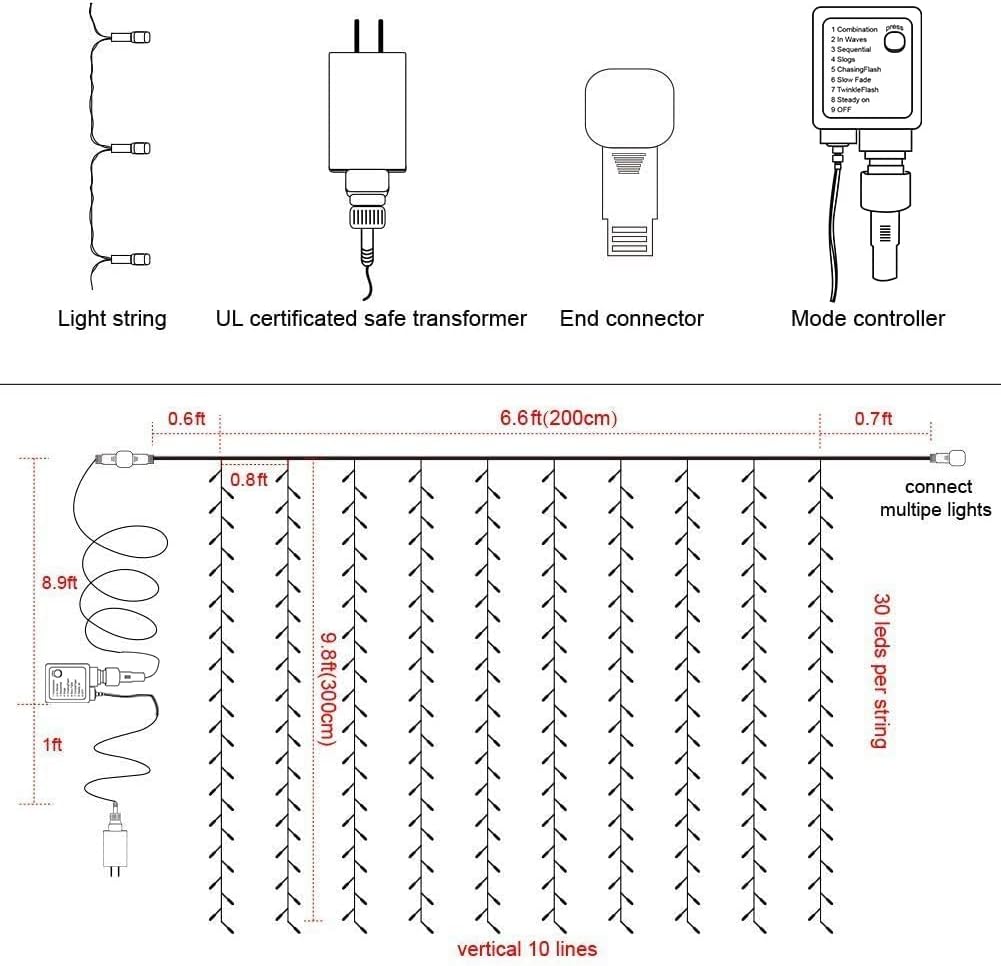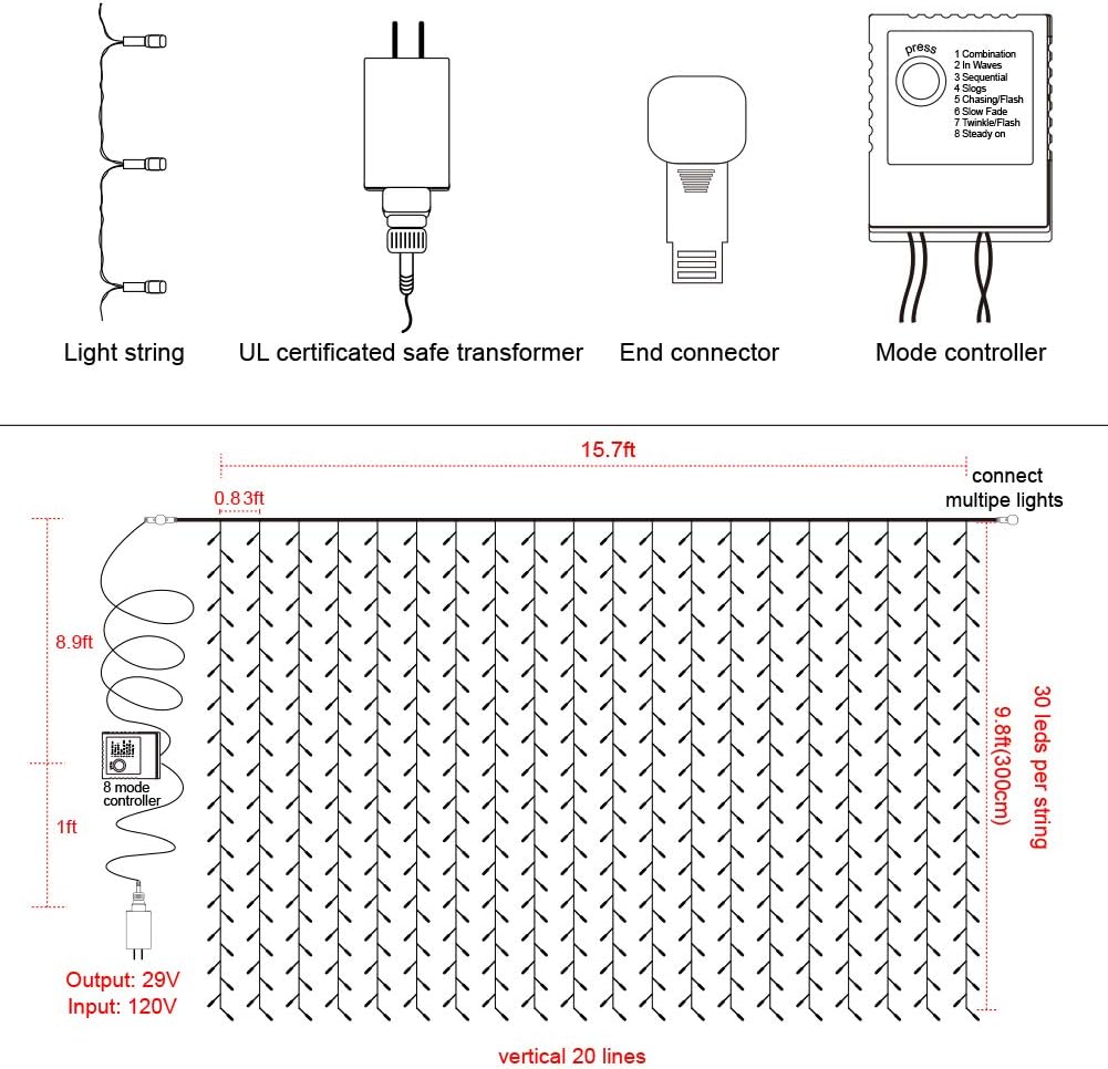 - Excellent High Quality: 6.6ft*9.8ft(width*length), 300 WARM WHITE LED lights. UL Certificated Output and wire: 29V Voltage Safe Curtain Lights with UL certified, leads to 29V safe output by UL plug-in transformer.