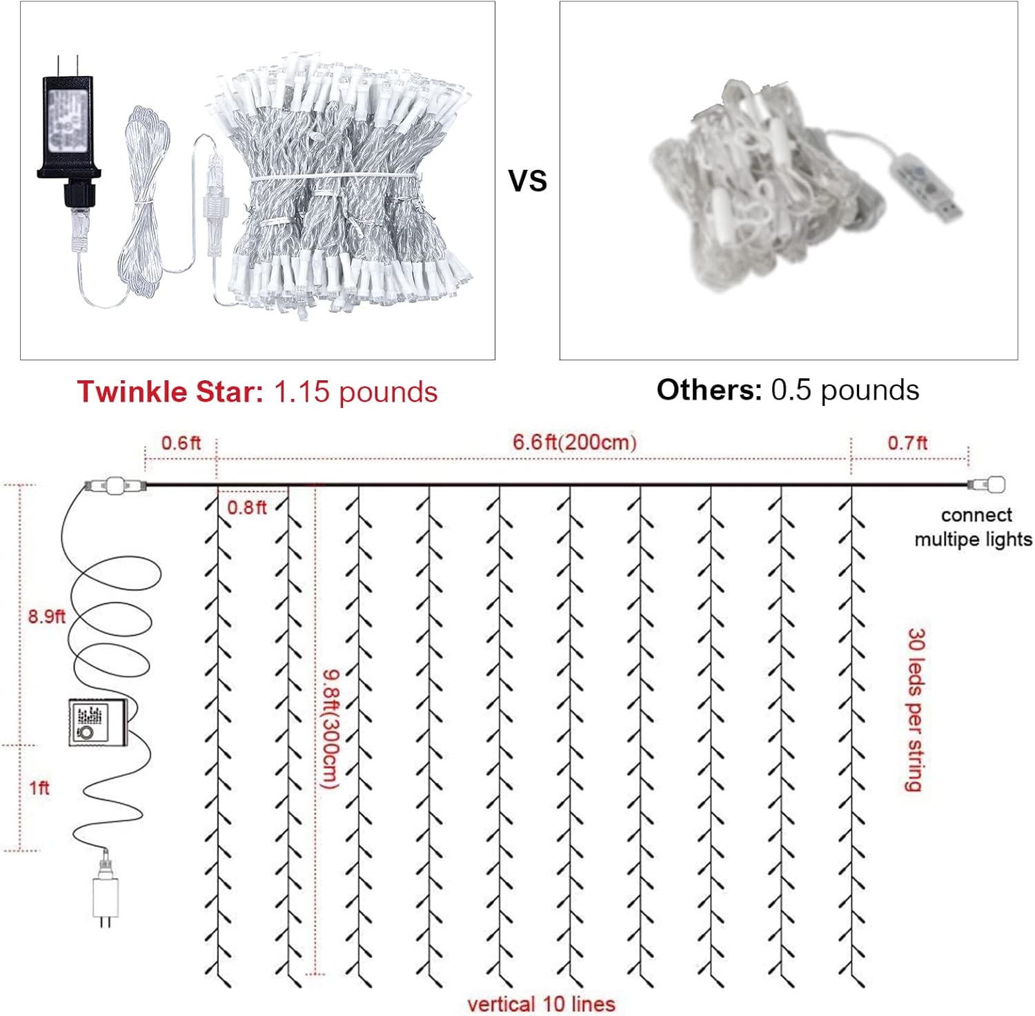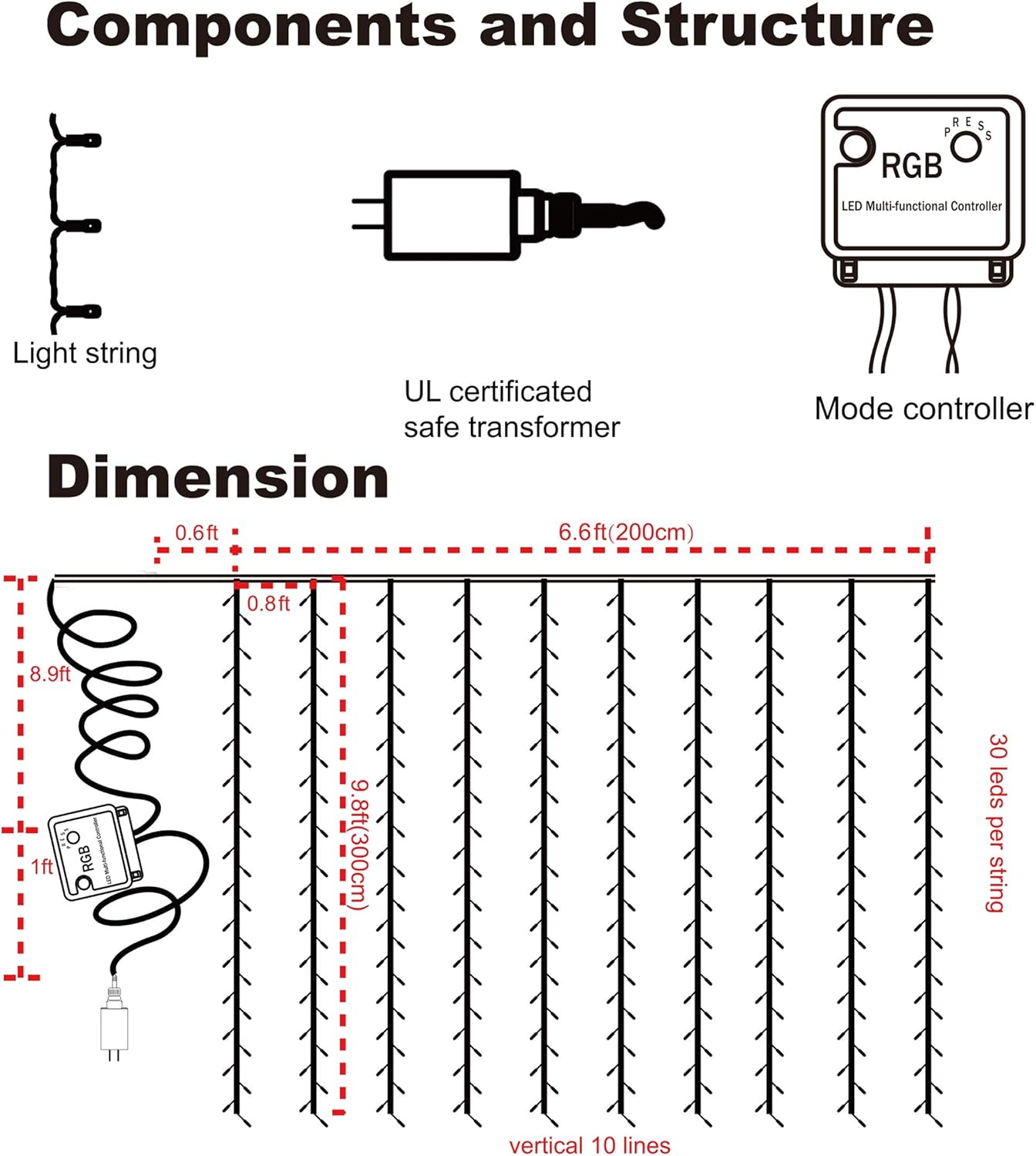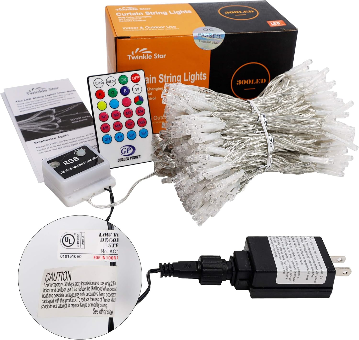 - Excellent High Quality: 6.6ft*9.8ft(width*length), 300 WARM WHITE LED lights. UL Certificated Output and wire: 29V Voltage Safe Curtain Lights with UL certified, leads to 29V safe output by UL plug-in transformer.