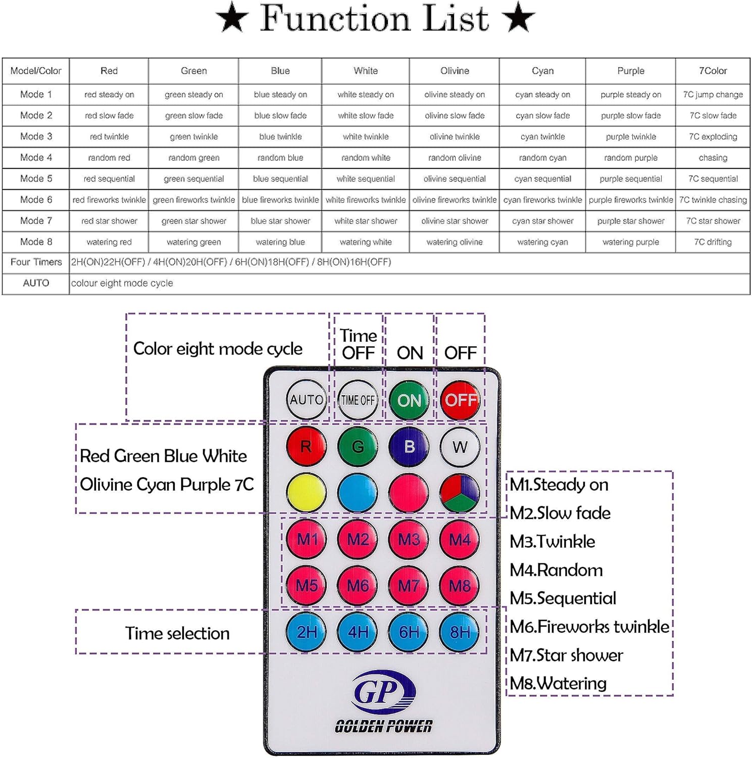 - 8 Modes settings: Includes an easy-to-understand adjustment of settings: combination, in waves, sequential, slogs, chasing/flash, slow fade, twinkle/flash, and steady on.