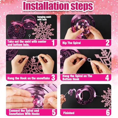 - Sparkling Winter Wonderland Theme: This 30 pack glittery snowflake swirl decorations set instantly transforms any space into a dazzling winter wonderland. Featuring 10 silver snowflakes, 8 white snowflakes and 12 pink snowflakes in 15 intricate snowflake patterns and 30pcs metallic foil cutouts swirls, these snowflake hanging decorations capture the magic of snowfall, creating a festive and enchanting holiday atmosphere