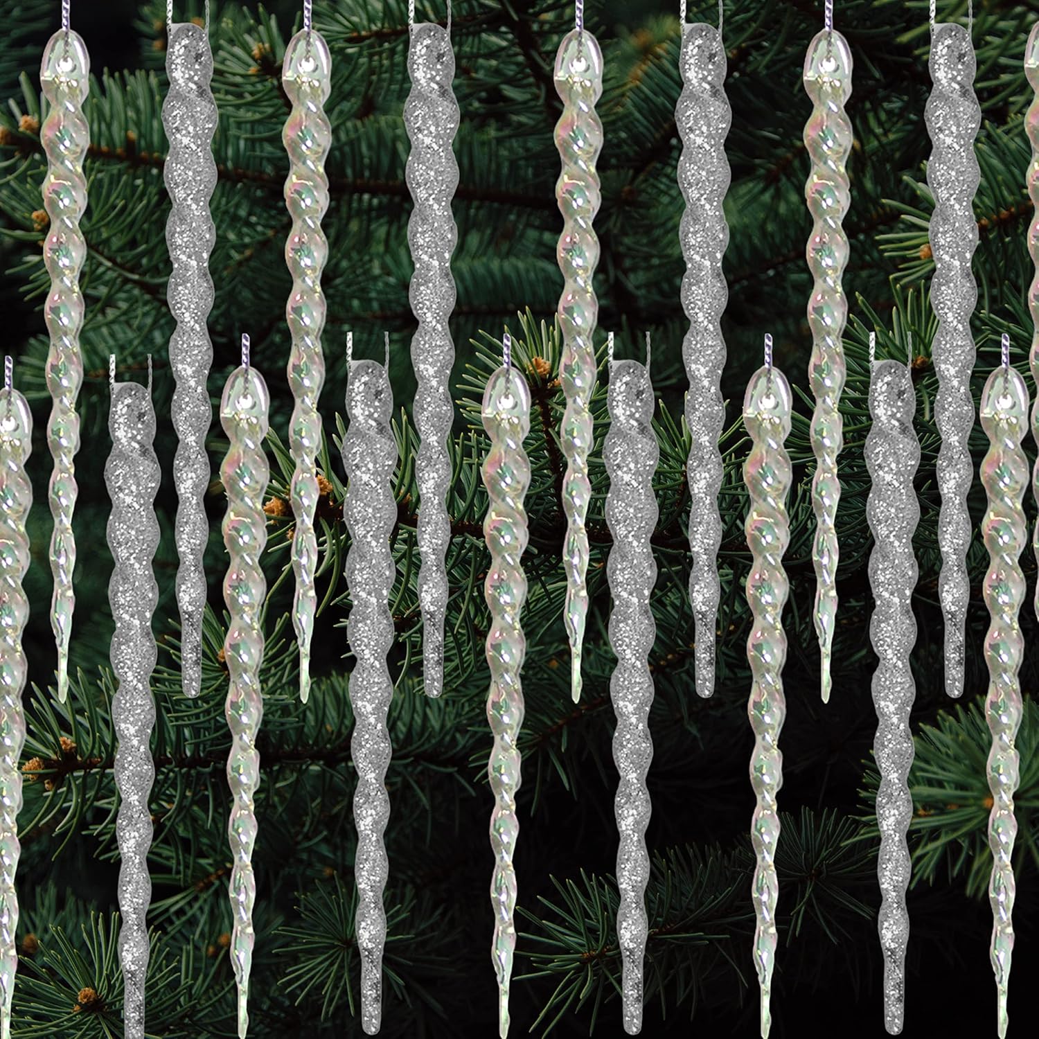- Icicle silver glittered ornaments for a Christmas tree. A 48-pack of icicles. Includes 24 glittery silver and 24 clear iridescent. These sparkling icicles are ideal for any winter wedding reception, holiday office party, stocking stuffers, or present toppers. Use them for your DIY Christmas projects. Each is 5"L