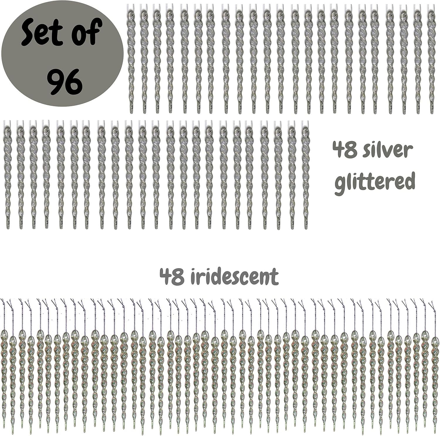 48-Piece Shatterproof Icicle Ornaments Set for Christmas Trees - 24 Glitter Silver & 24 Clear Iridescent - 5” Long