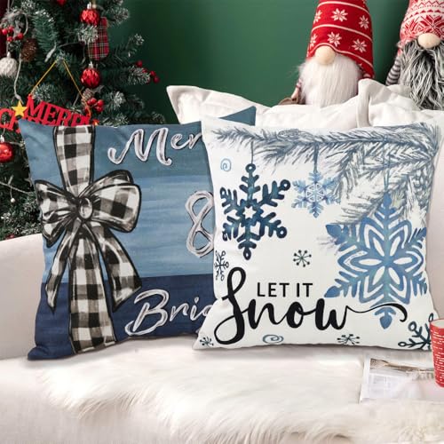 4PCS Christmas Throw Pillow Covers 18x18 Inch, Blue Snowflake Winter Holiday Wishes Pillow Cases Christmas Trees Seasonal Cushion Covers for Home Sofa Couch Outdoor Decoration