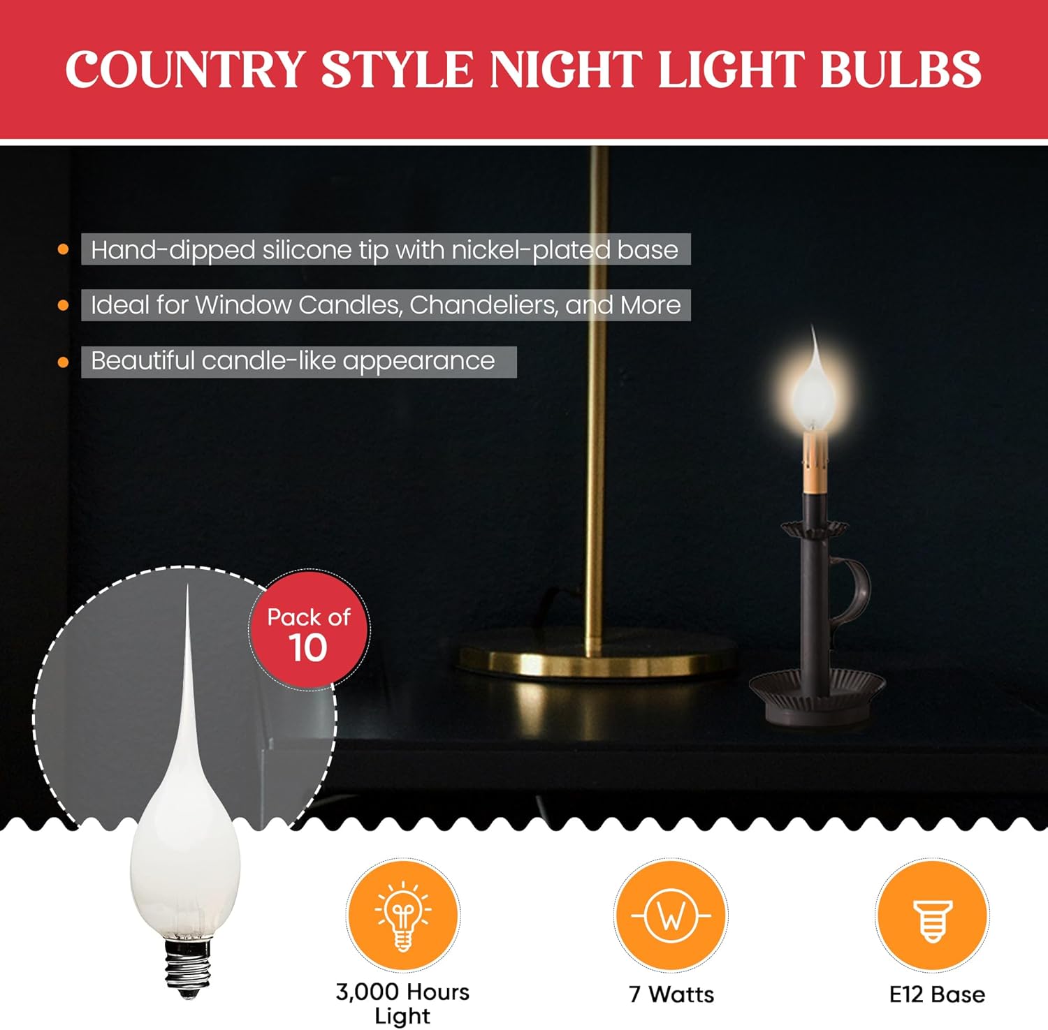 - SILICONE TIPPED BULB - 10 Pack of 7 watt Incandescent Country Style Night Light Bulbs replacement light bulbs for candle lamps.