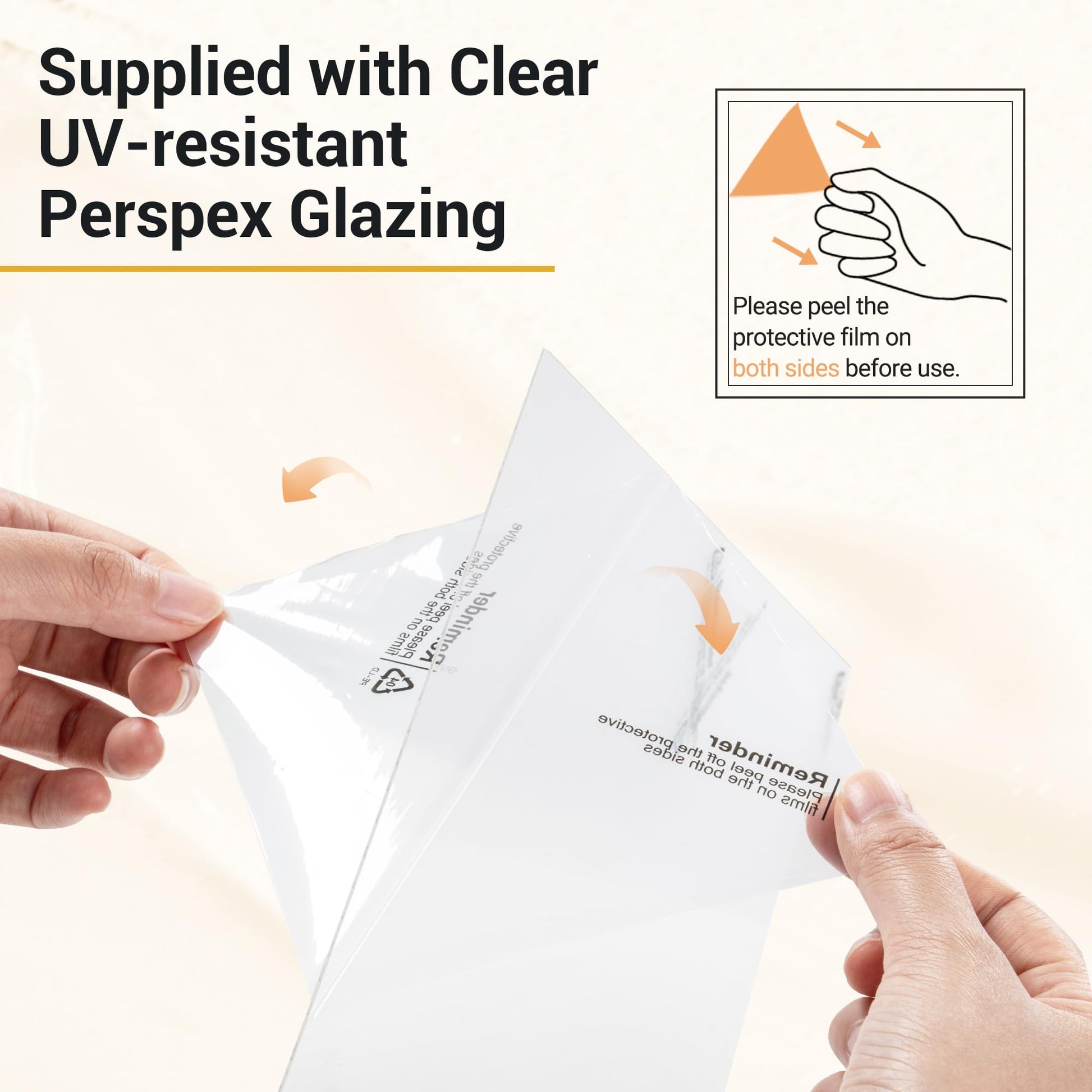 - [SAFE & EASY SETUP]: Featuring a plexiglass front for a crystal-clear view, the photo frame provides shatter-resistant protection that is safer than traditional glass. The back comes equipped with turn tabs for quick and easy photo placement, and sturdy hanging hardware ensures a secure wall mount, simplifying the installation process.