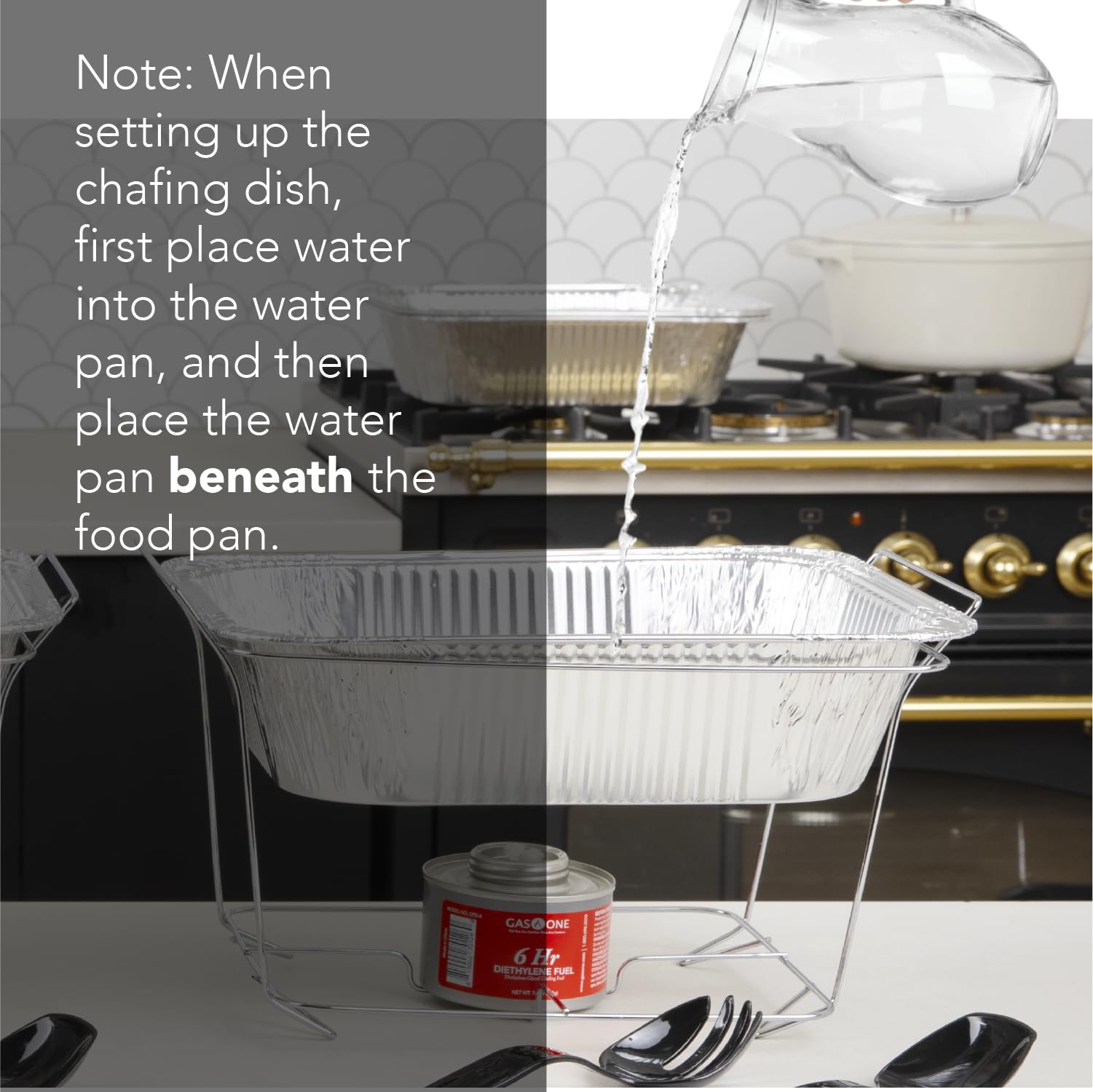 - Complete Chafing Dish Set: Our chafers and buffet warmers sets include all the tools and accessories for a perfect buffet setup! This set includes 6 x chafing dish wire rack, 3 x sets of utensils, 6 x aluminum half size pans, and 6 x cans of high-quality fuel for chafing dish that can last up to 6 hours/can!