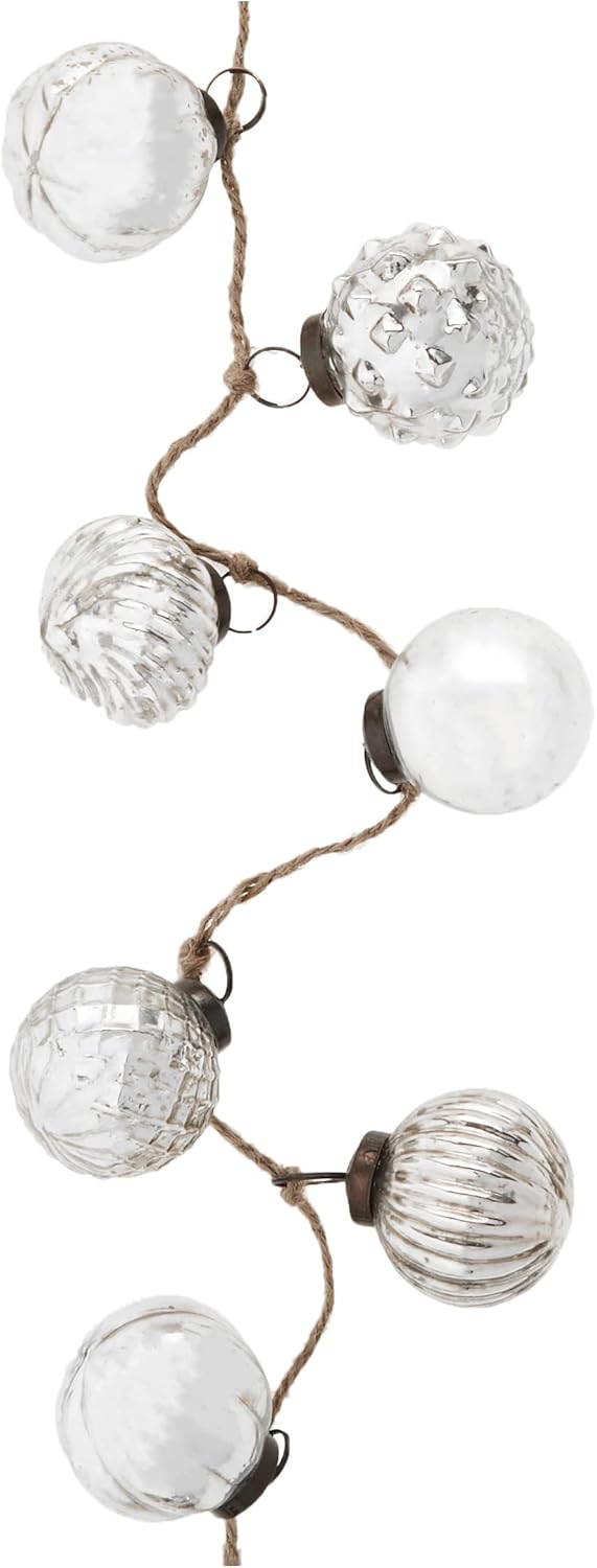 Enjoy the various designs of these glass ornaments. They are attached to a small rope with bronze toppers and create an antique garland to be envied by all. Lay it on a surface around larger items, add to a decorative piece filled with other items, hang on a fireplace mantel or in front of a window.