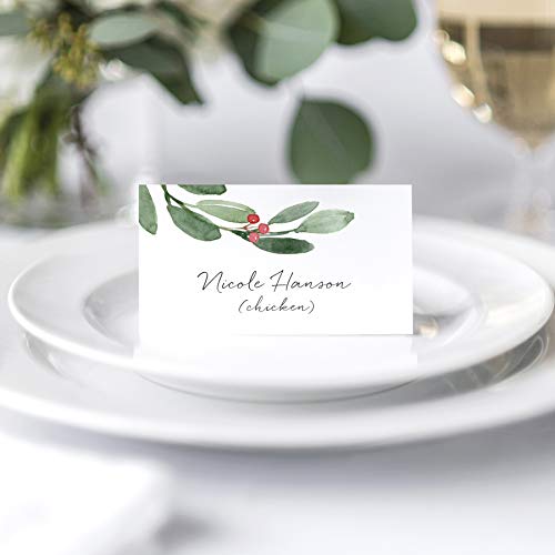 Bliss Collections Greenery Holiday Place Cards for Christmas Party, Wedding or special winter event! Seating Place Cards for Tables, Scored for Easy Folding, 50 Pack, 2 x 3.5 Inches