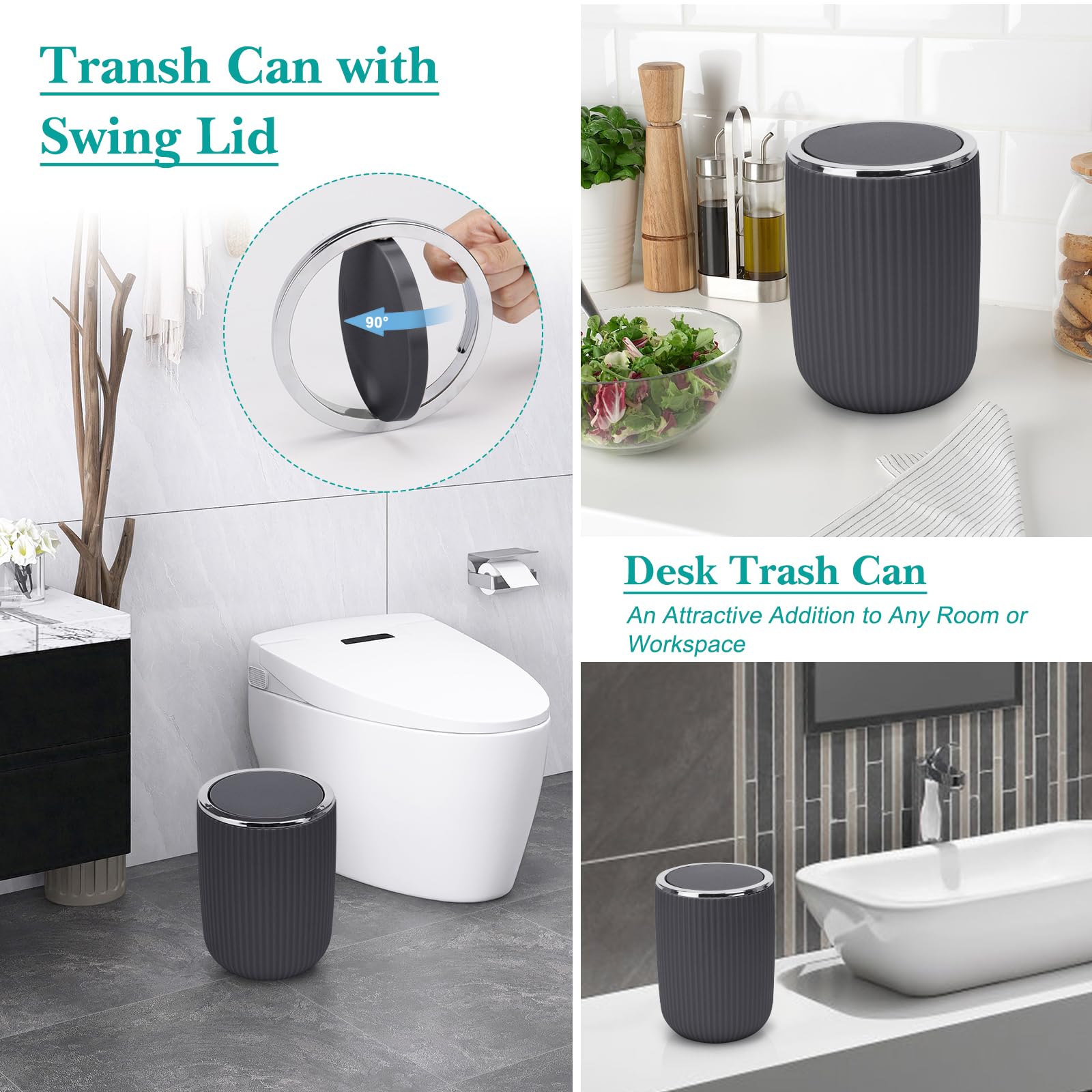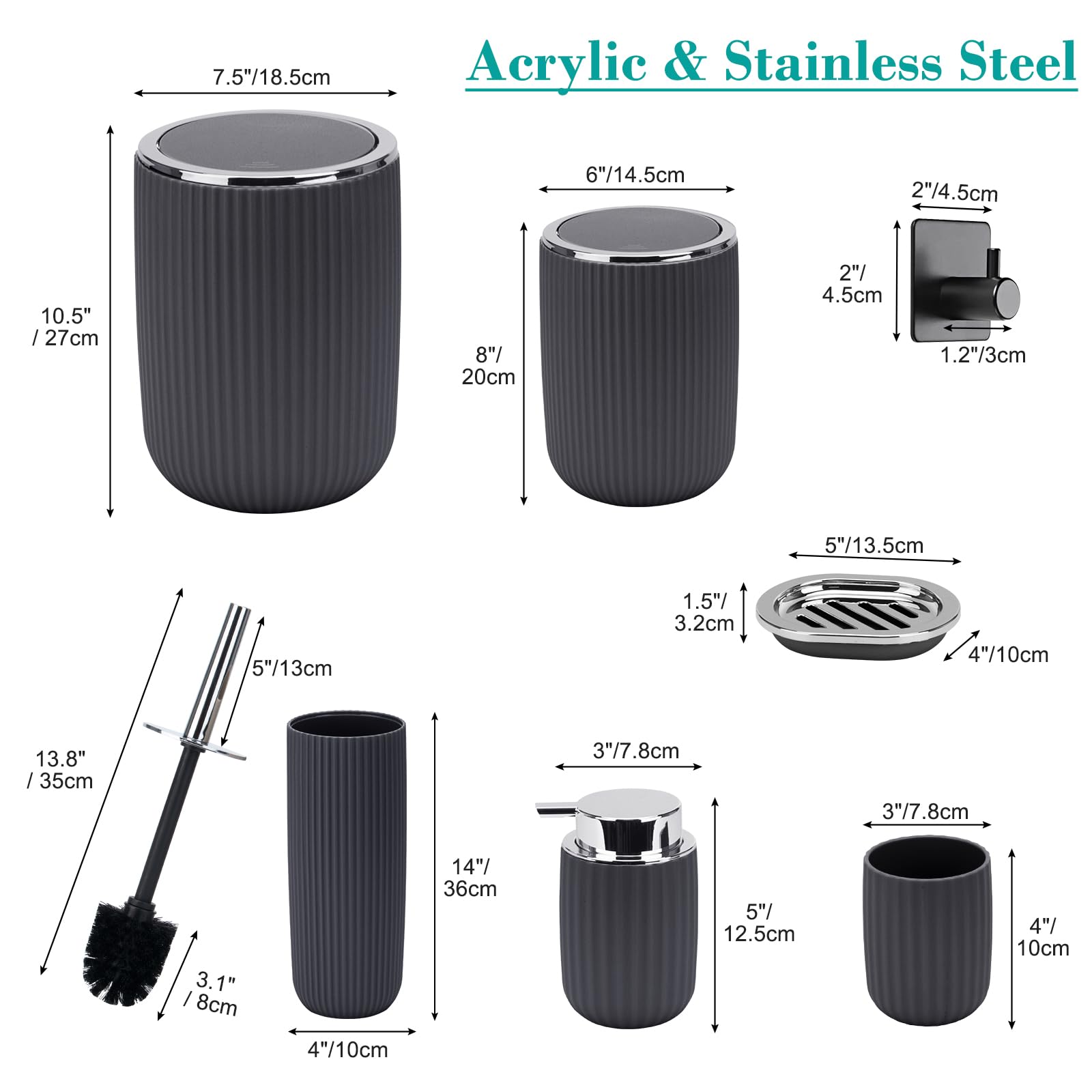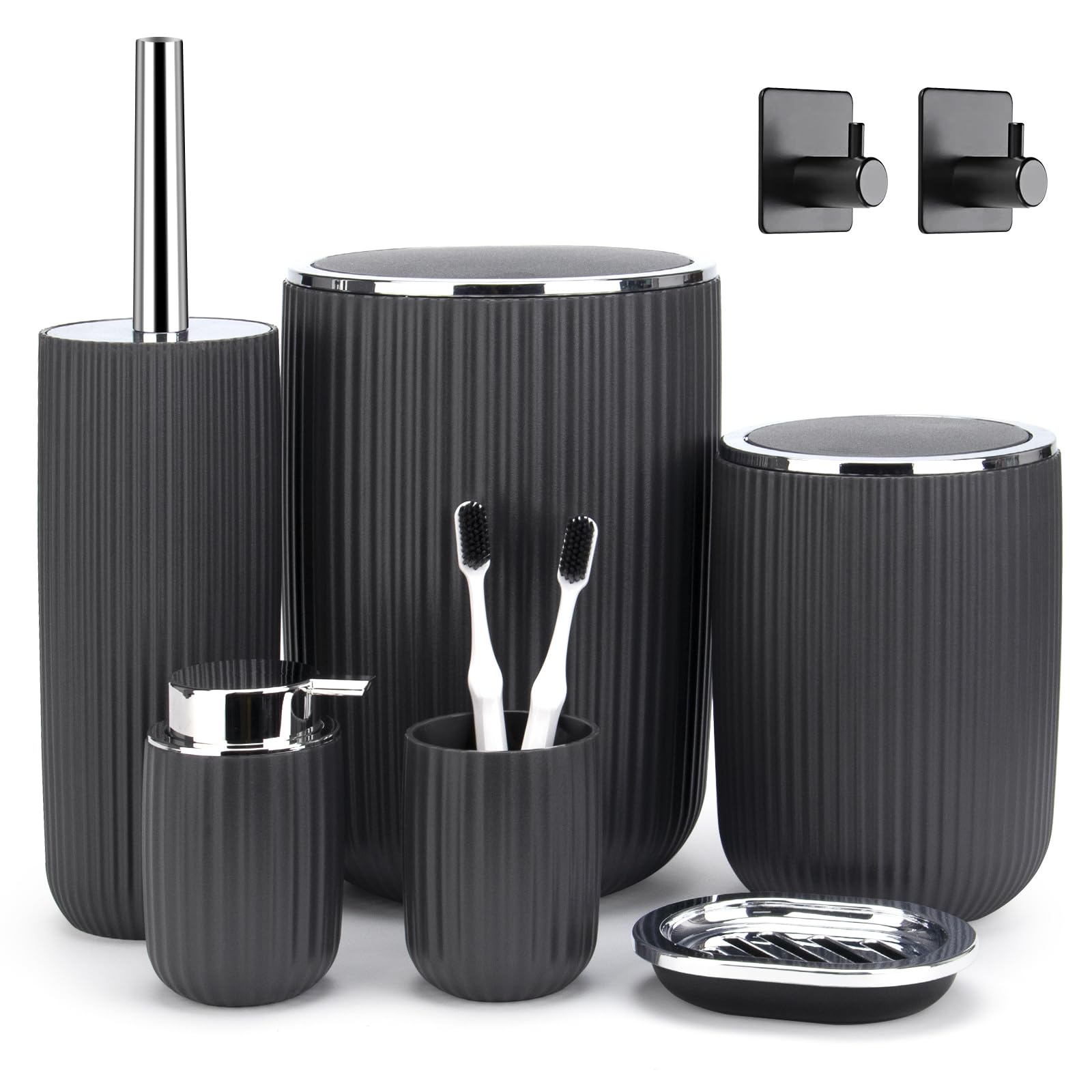 - Comprehensive 8-Piece Set: Elevate your bathroom essentials with our bathroom accessories set in a stylish deep gray finish. The package includes two size trash cans, one toothbrush cup, one soap dish, one lotion dispenser, one toilet brush, and two adhesive hooks, ensuring you have everything you need for a tidy and organized bathroom.
