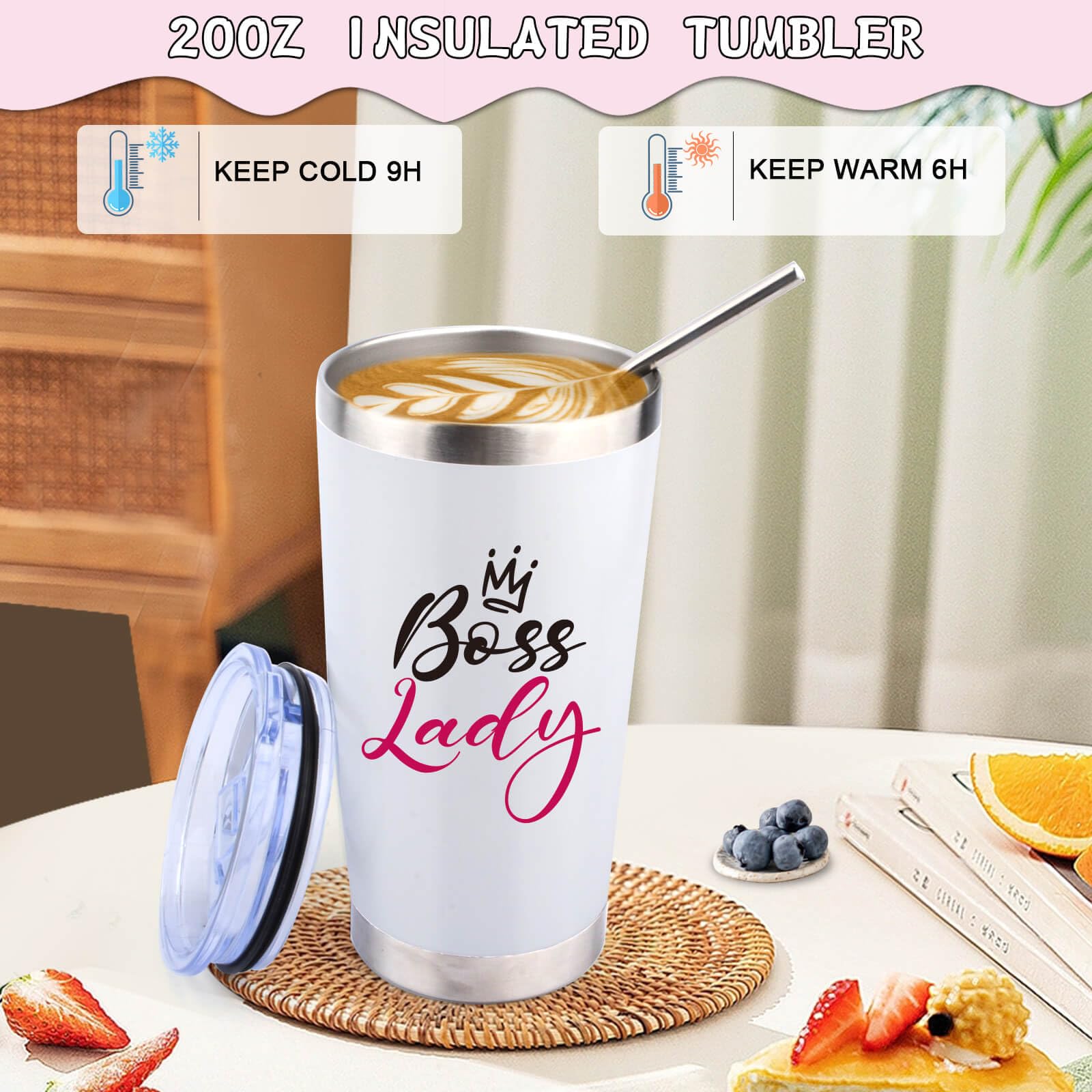 - [ Boss Lady Tumbler for Women] : Made of stainless steel, the boss lady tumbler features advanced dual-vacuum insulation technology that ensures your beverage remains at the ideal temperature - hot or cold - for an excellent drinking experience. We provide a stainless steel straw along with a straw brush that enhance usability and ease of cleaning. This is a premium mug gifts for your boss female, women and lady boss.