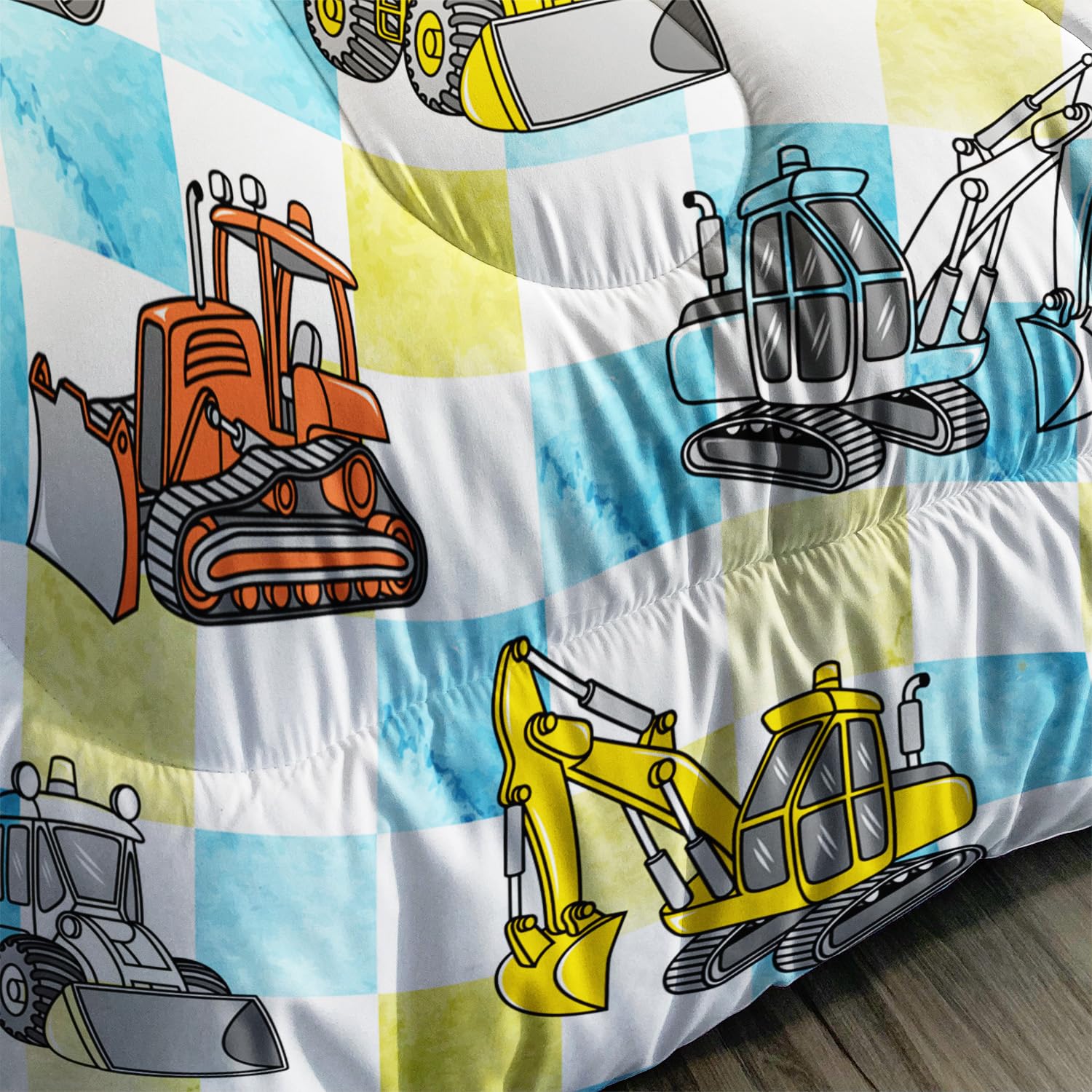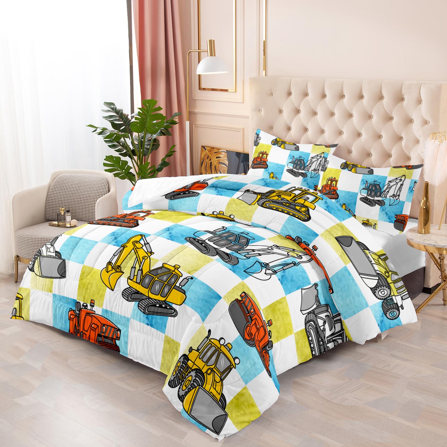 Boy's Construction Truck Comforter Set Full,Orange,and Yellow Truck 3 Pieces Bedding Set for Kids Boys Teens,Blue and Yellow Plaid Microfiber Lightweight Quilt Bedroom Decor with 2 Pillow Cases
