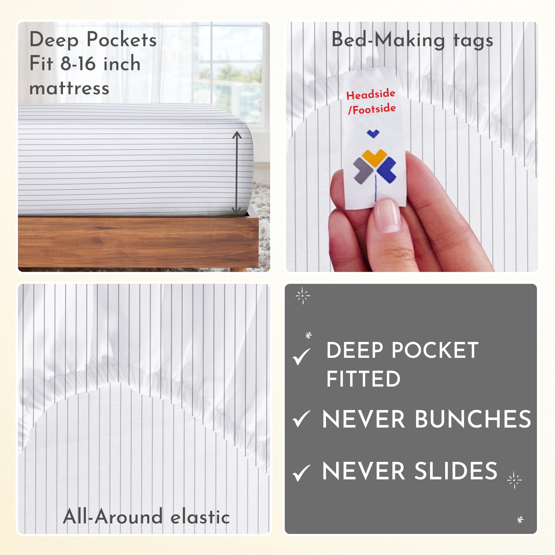 - FITS PERFECTLY: Our 4-piece sheet sets are expertly crafted with quality stitching. The fitted sheet has 16-inch deep pockets, so it will fit mattresses from 8-16 inches deep. The strong elastic ensures that these deep pocket queen sheets will not pop off or become loose over time. Our fitted sheet also feature a headside/footside indicator for a seamless bed making experience. Upgrade your bedroom with our luxurious cotton bed sheets for a comfortable and cozy sleep.