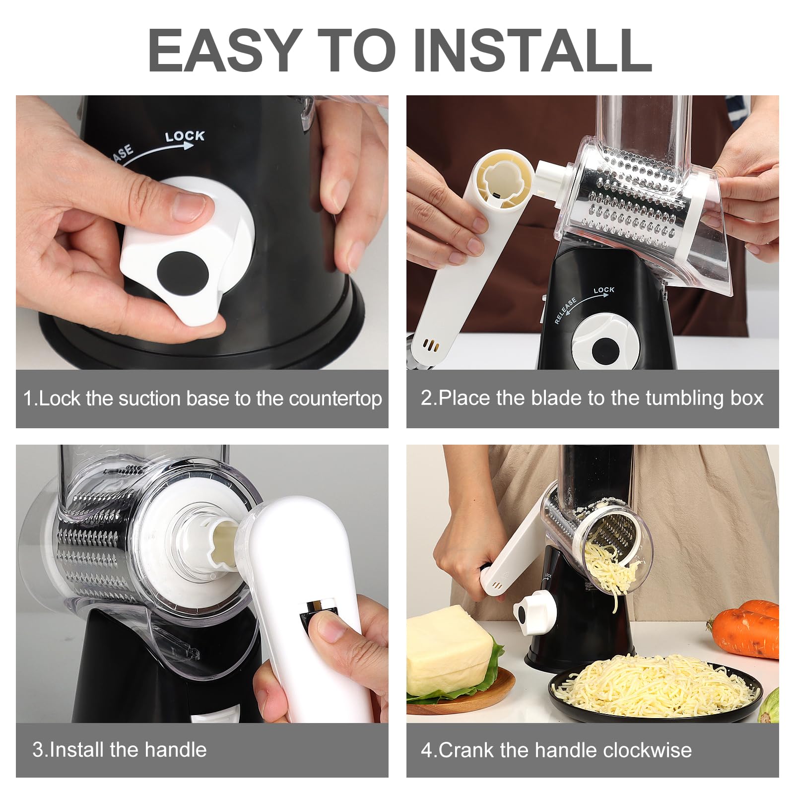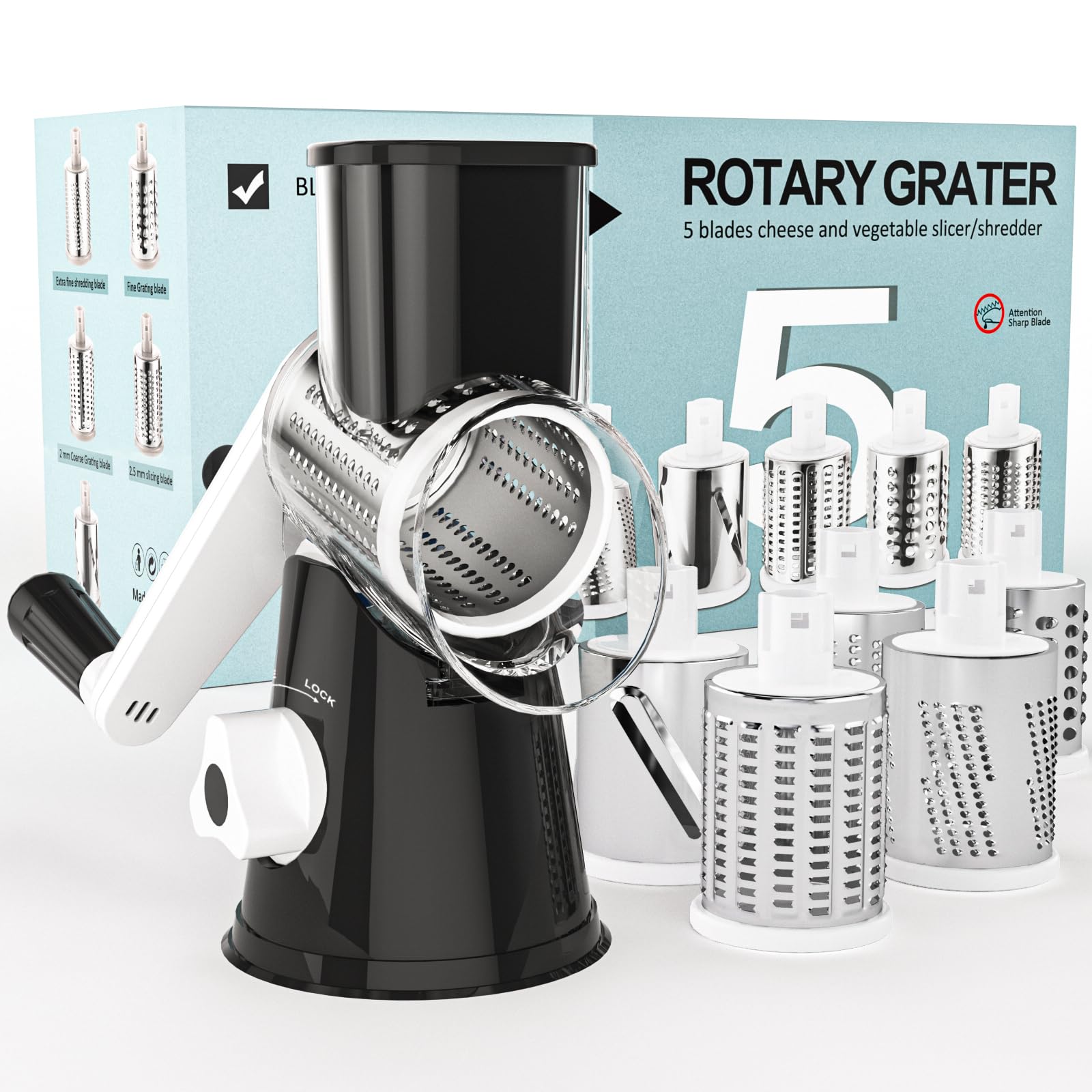 Cambom Rotary Cheese Grater Hand Crank Cheese Shredder for Fresh Cheese, Vegetable, Nuts,Non-slip Suction Base, Five Blades, Black