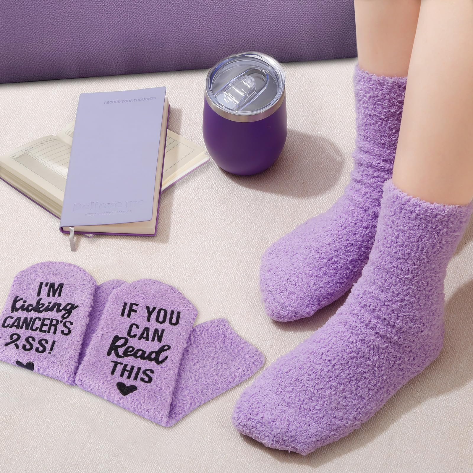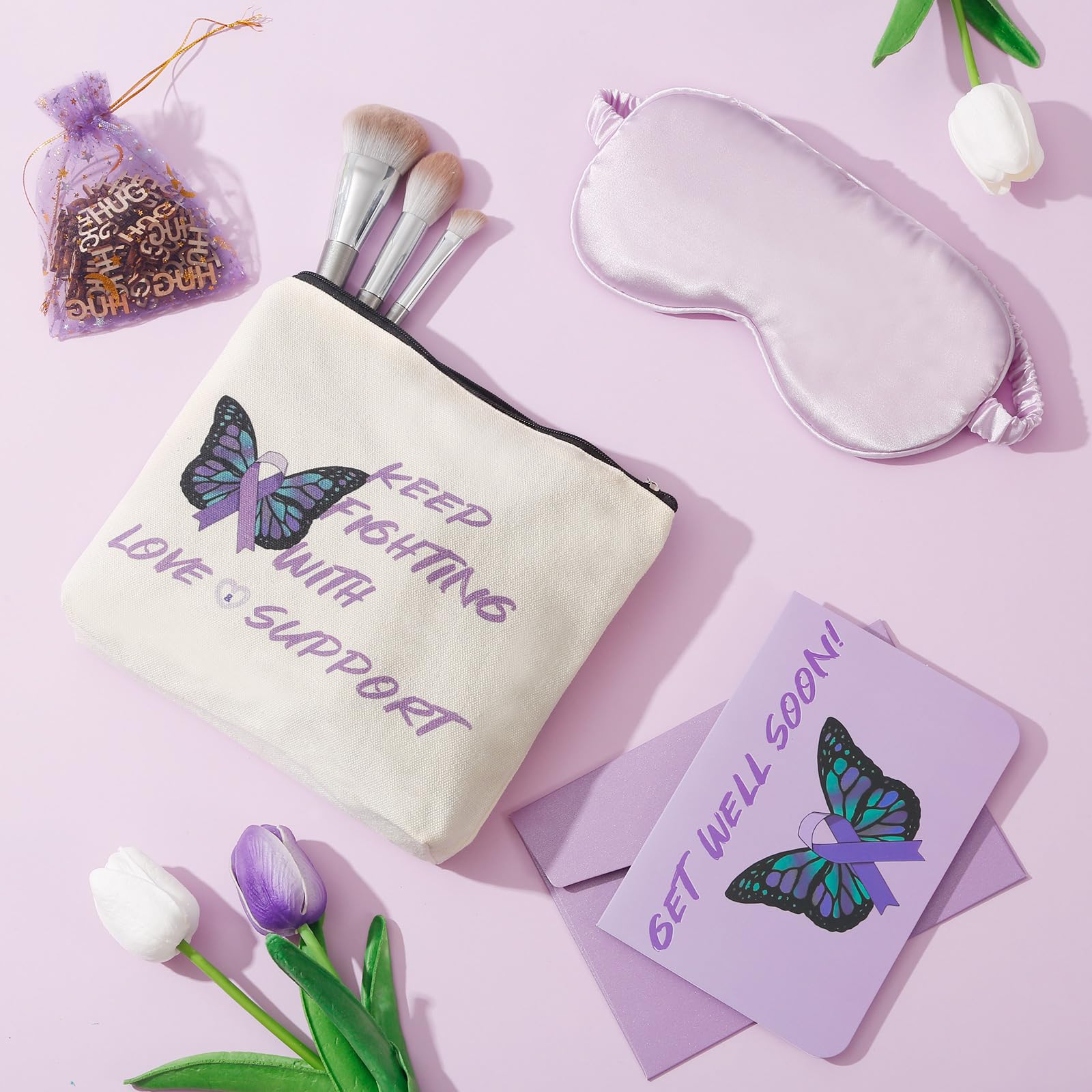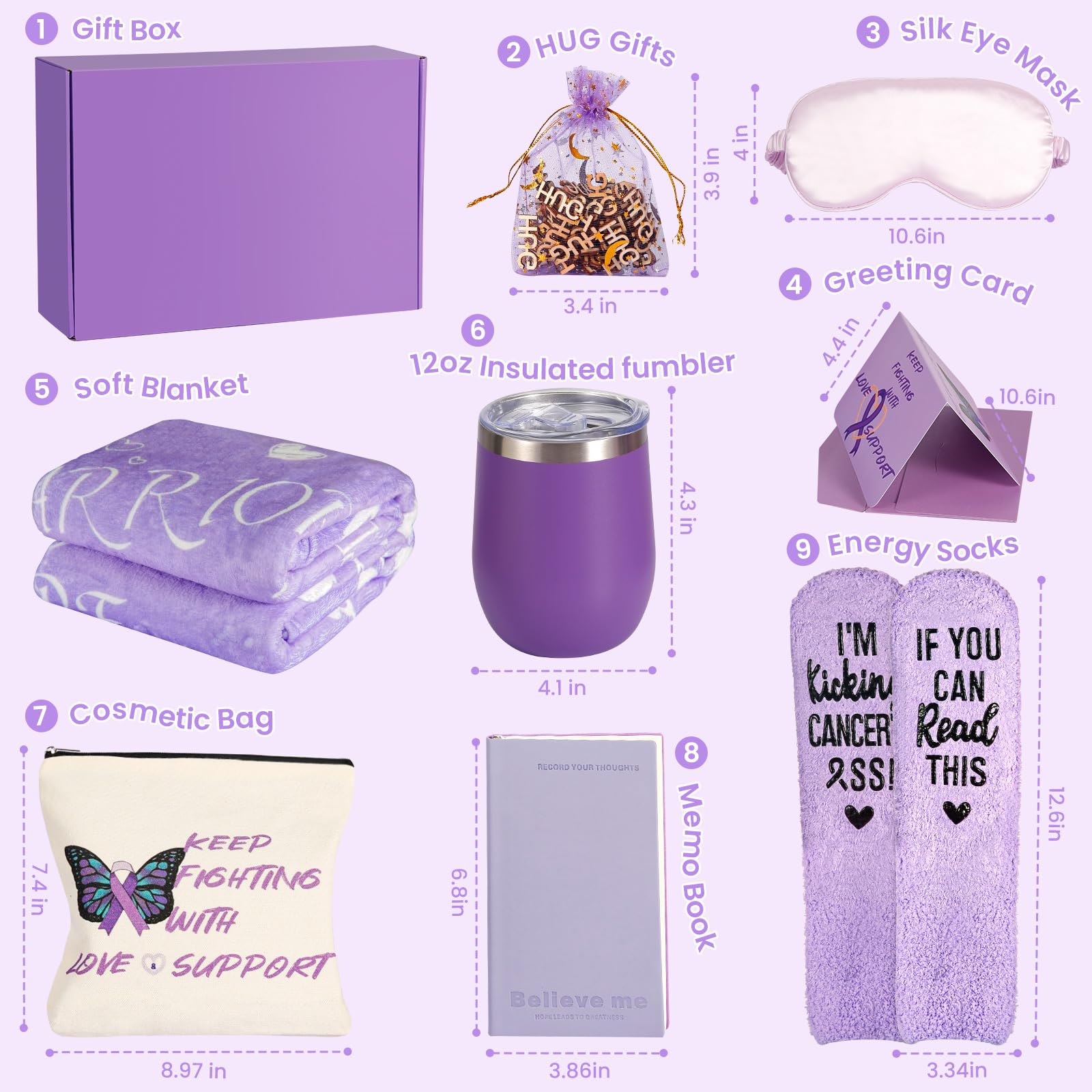 - Thoughtful Gifts for Cancer Patients:Healing blankets, cosmetic bags, socks, greeting cards, memo pads and HUG bags are embedded with classic elements of purple ribbons and inspirational quotes, such as "Get Well Soon!", "Keep Fighting with Love & Support". These get well soon gifts for woman will bring hope, courage and the warmth of spring sunshine to your loved one.