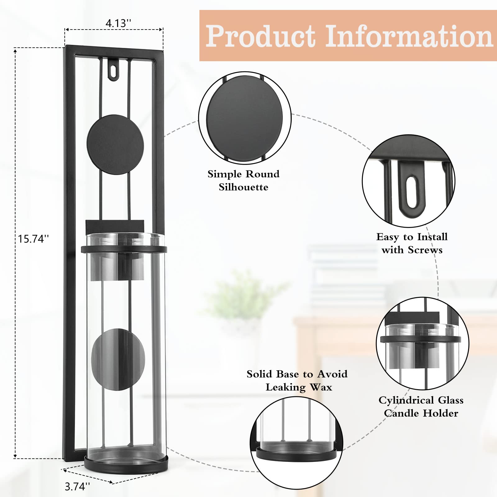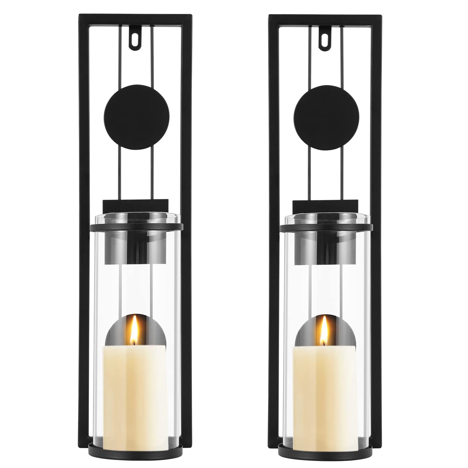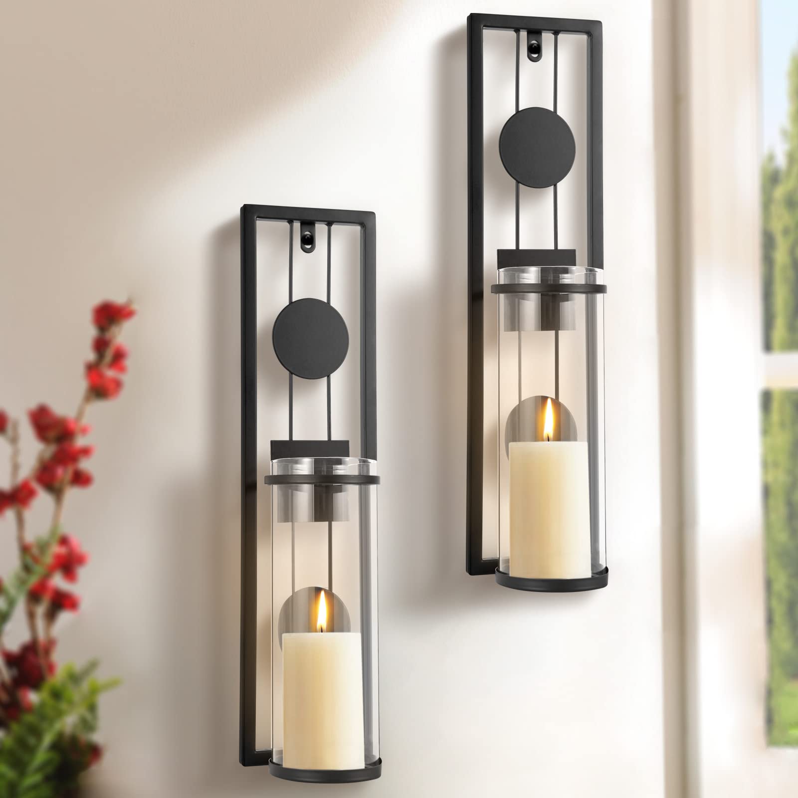 Candle Sconces Wall Decor Set of 2 Black Candle Holders Glass & Metal Candle Wall Sconces Hanging Candle Holders, Fireplace Mantel Decorations for Living Room Dining Room Kitchen Bathroom Bedroom Wall