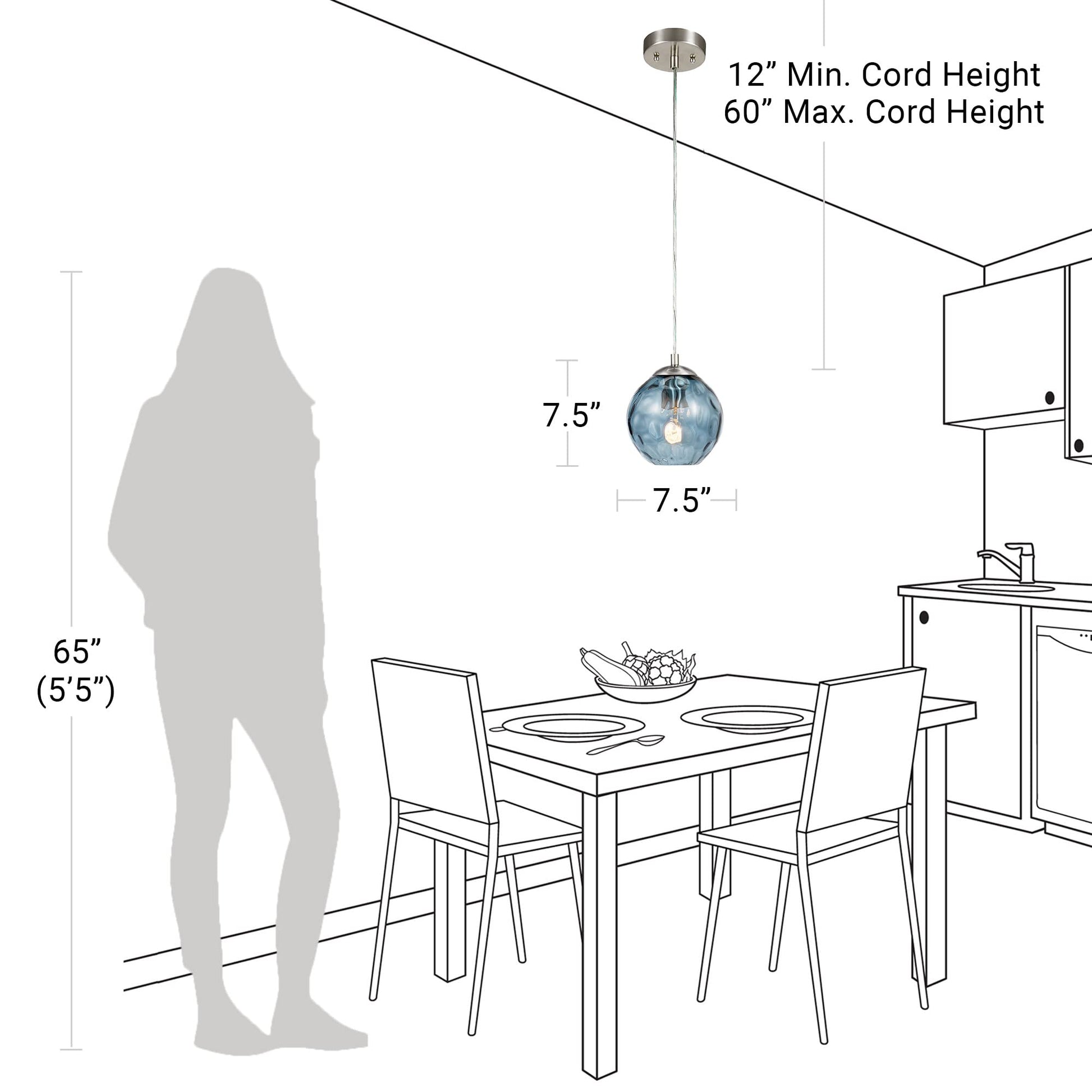 Details: Cultivate a subtle hint of coastal elegance in your home with the Catalina Contemporary Hammered Glass Mini Pendant Ceiling Light. This trendy mini-pendant light adds ambient illumination to any kitchen, living room, hallway, bedroom, or bathroom. With a breathtaking hammered blue glass shade and brushed steel accents, you can dim and customize your lighting to match your a nautical hideaway or a modern-chic haven aesthetic. This versatile pendant hangs beautifully as a series of three over kitchen island, a set of two over bedside tables or solo over a small dining table or kitchen sink. For your convenience, the brushed steel metal canopy mounts to any standard ceiling junction box using the included mounting hardware. Created to be hardwired into your home, this hanging light fixture is made from high-quality steel and glass, and is compatible with a 60-watt incandescent or LED-equivalent bulb, sold separately. A 69-inch long chain makes this lightweight fixture perfect for sloped ceilings and a variety of ceiling heights. This pendant light measures 7.5" x 7.5" x 69", for accessible and convenient lighting anywhere in your home.