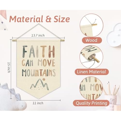Christian Kids Wall Art Canvas Banner,Faith Can Move Mountains,Bible Verses Wall Hanging Pennant Flag Canvas Banner for Playroom Classroom Baby Kids Bedroom 15x11in