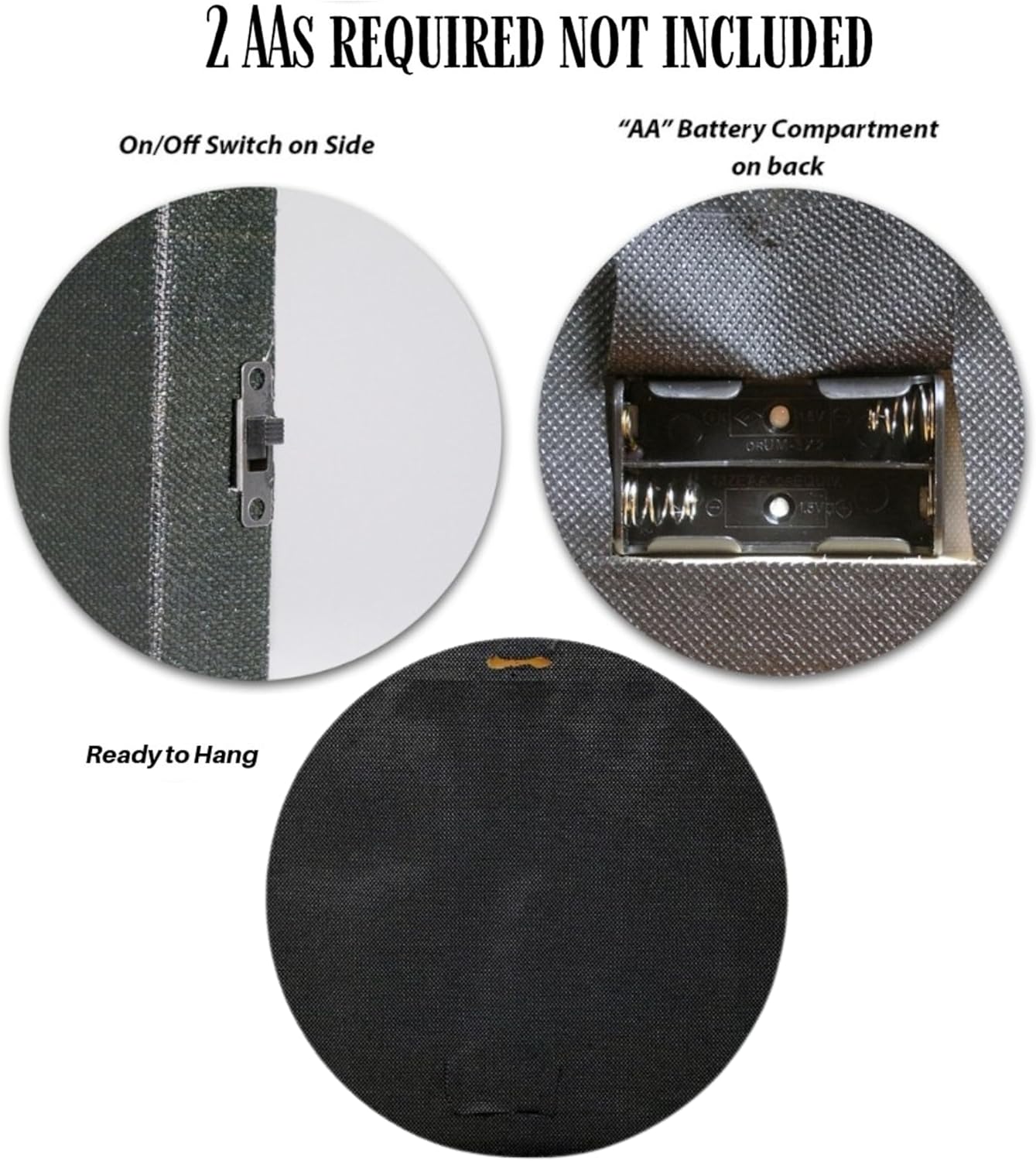 - Christmas wall decor. There are 5 LED lights in the windows. This bright picture shows an evening setting with a snowy environment. Measures 12"H X 16"W. Batteries not included