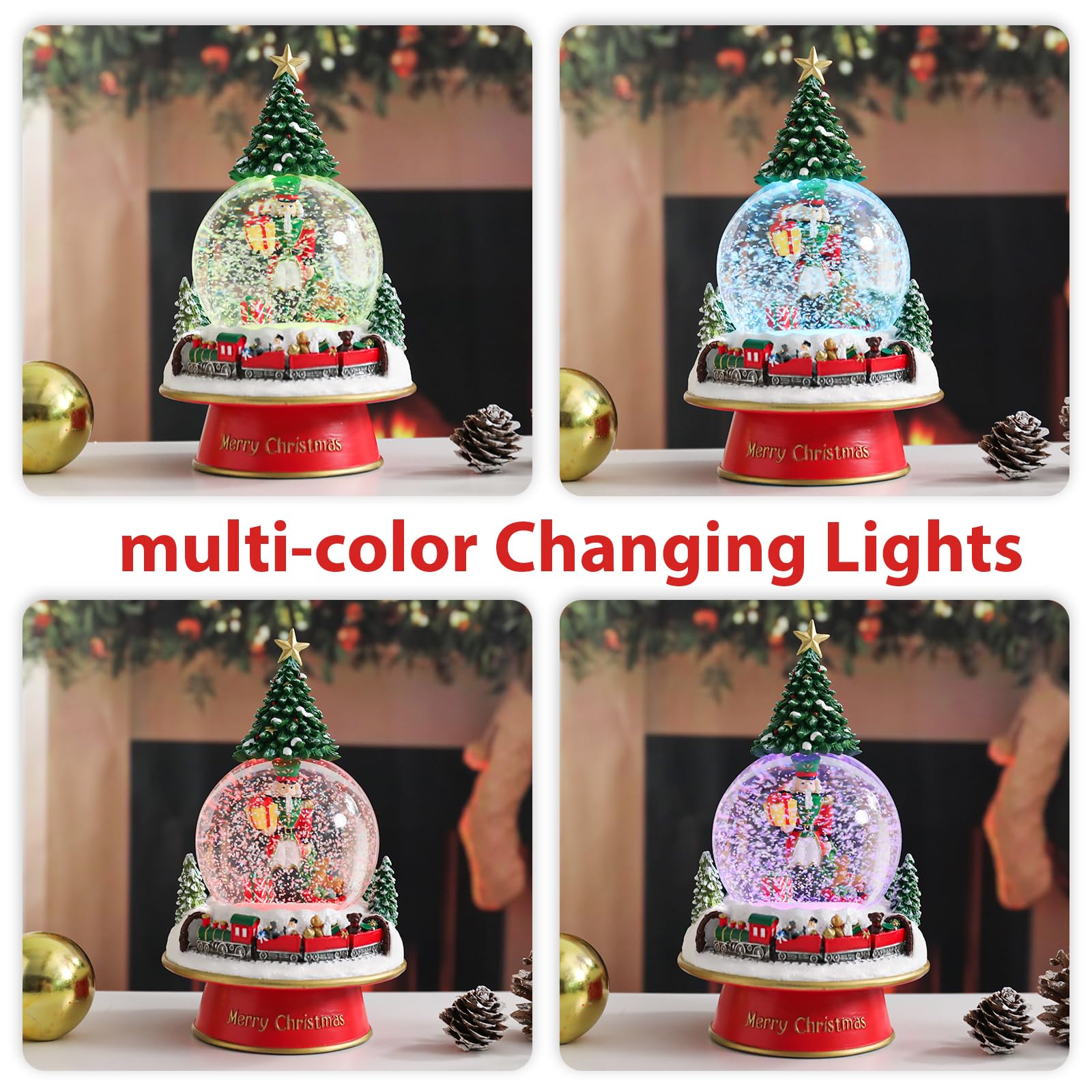 - Beautiful Christmas Snow Globes - Musical snow globe is design with nutcracker figurine, train base and Christmas tree shape. When you turn on mode one: snow globe started to ring Christmas songs, totaling 8 songs and with colorful light changes; when you turn on mode two: snow globe switches to warm light mode
