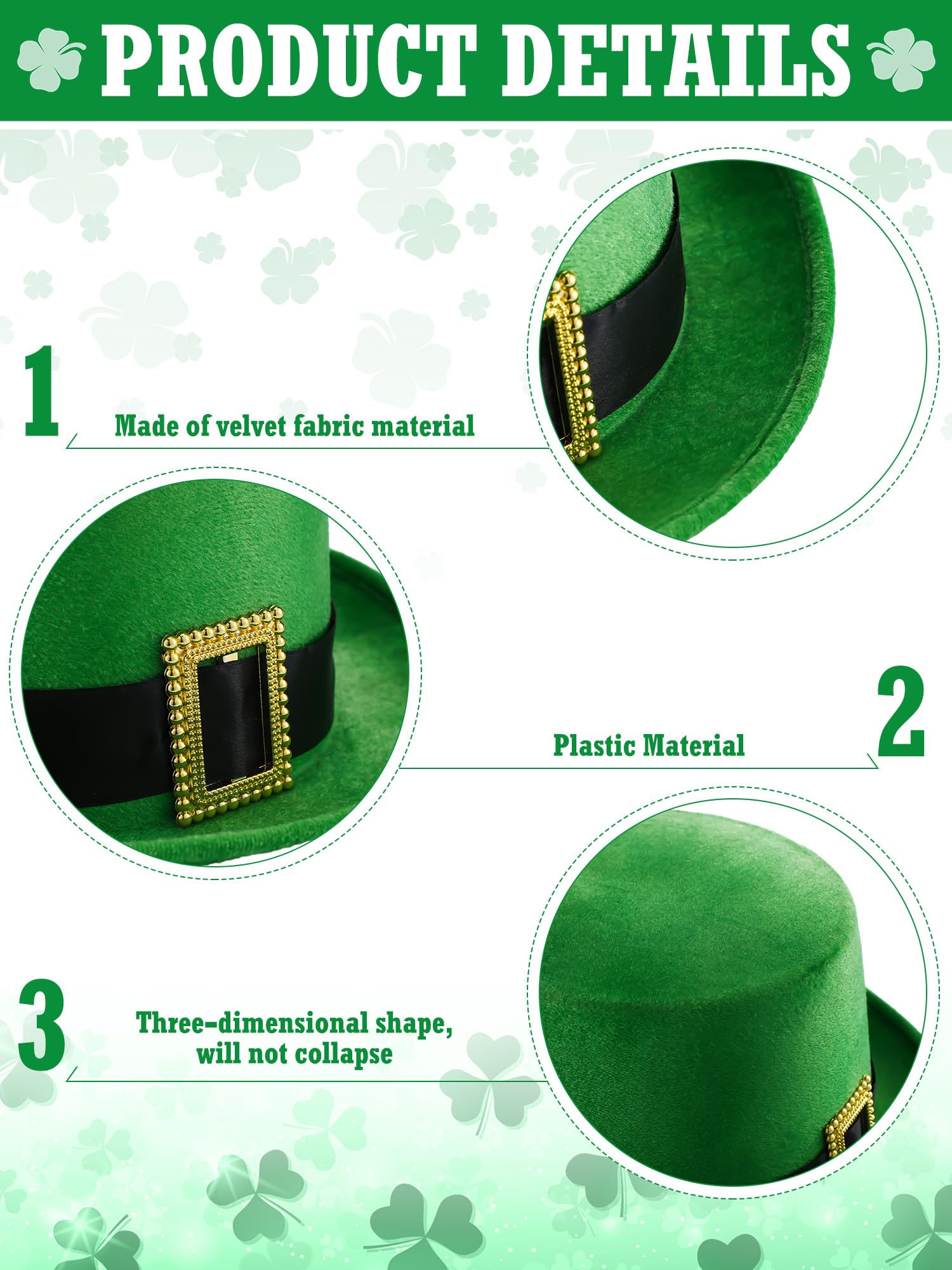 - St. Patrick's Day Leprechaun Hat: the velvet top hats adopt green as the main color, adorned with black band and buckle, vibrant and eye catching; Through the usage of vivid shades, as shown in the pictures, our hats strive to encapsulate the spirit of St. Patrick's Day, ensuring you stand out in the crowd and become a magnet for compliments