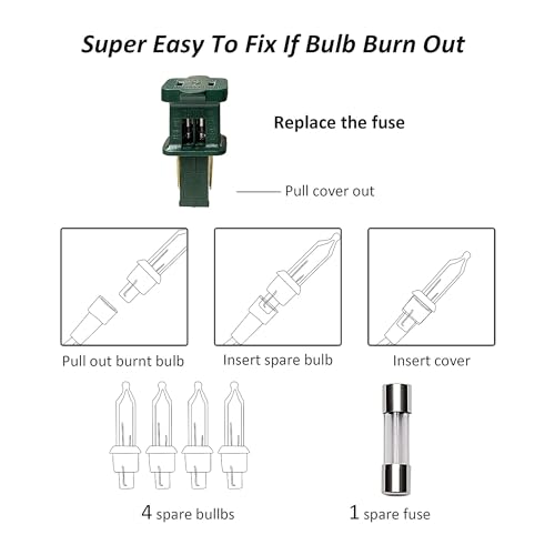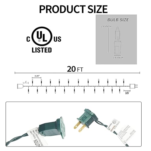 - Christmas Mini String Lights: The Christmas mini string lights includes 100 count incandescent light bulbs, the total length is 20 ft, the length of string light is 18.5 ft, lead wire is 1.5 ft, spacing between each light is 2.25 inches. Package Includes: 1 x 20 ft light string, 1 x spare fuse, 4 x additional incandescent bulbs.