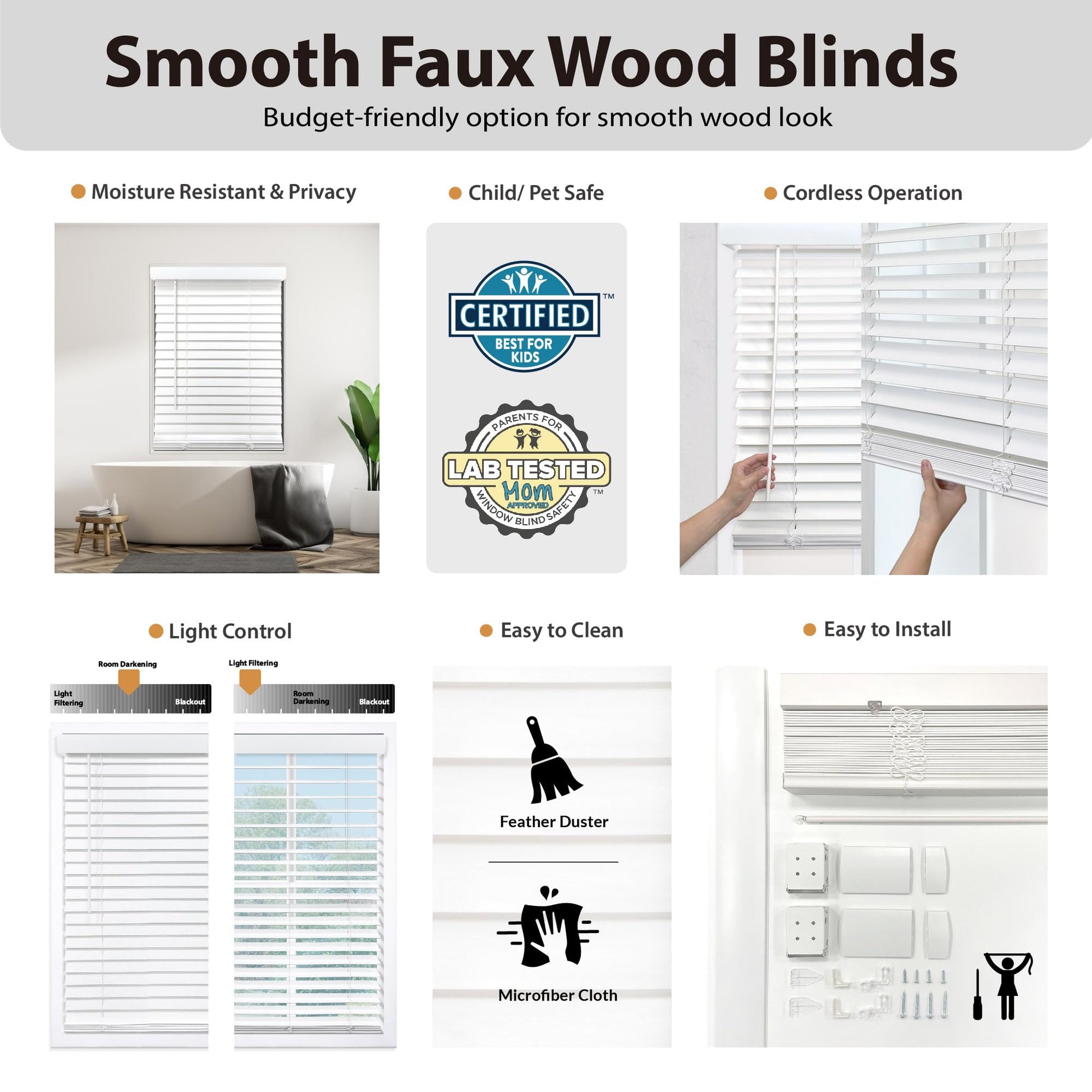 - Versatile and Durable: Perfect for home and commercial use. These faux wood blinds are moisture-resistant, ideal for bathrooms, kitchens, and any room. Inside or outside mount options offer a seamless fit.