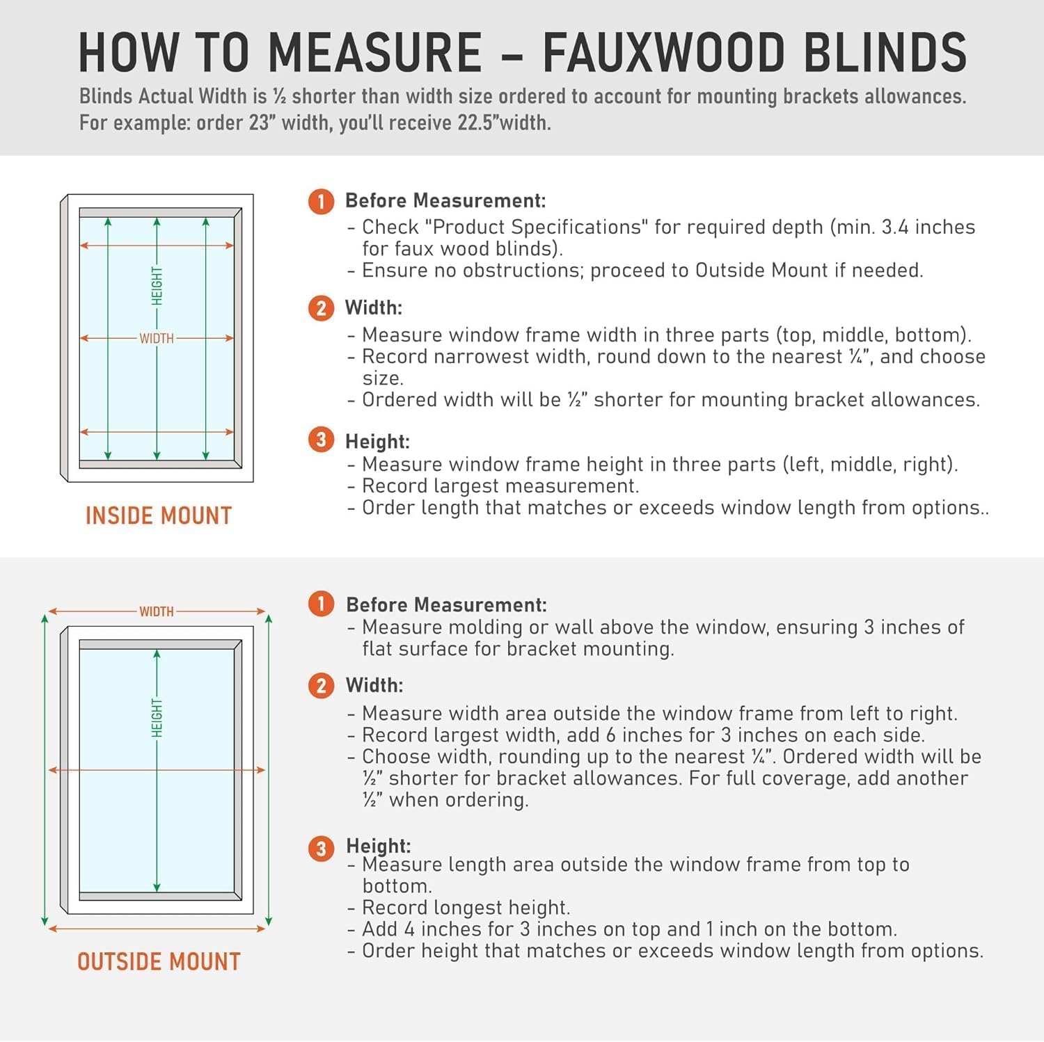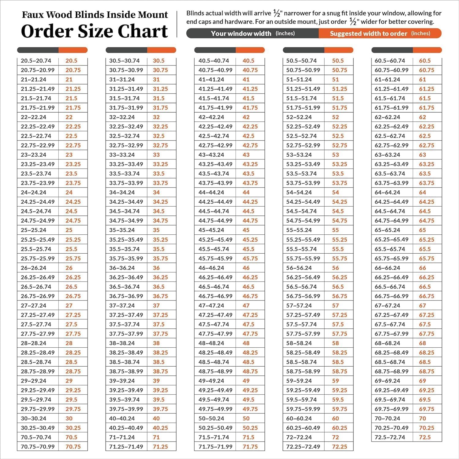 - Blinds actual width will arrive ½" narrower for a snug fit inside your window, allowing for end caps and hardware. For an outside mount, just order ½" wider for better covering.