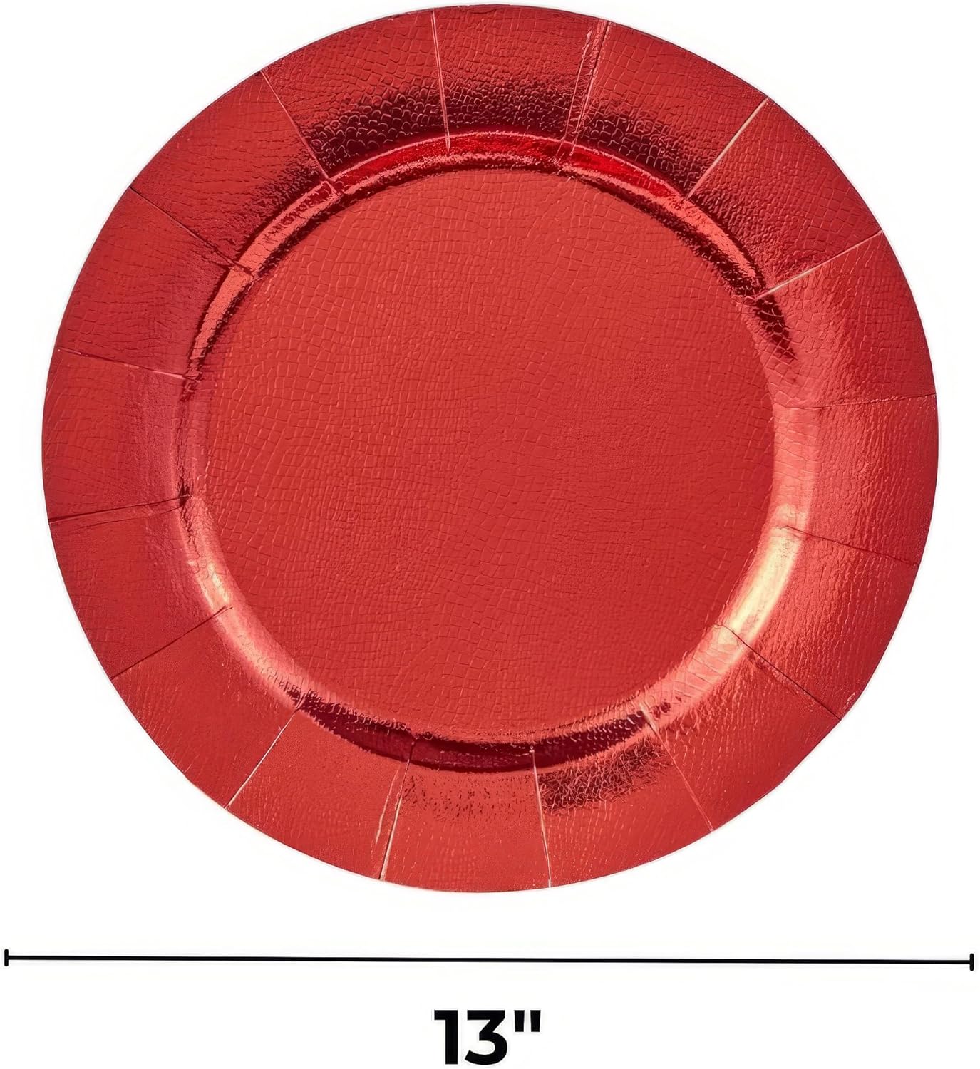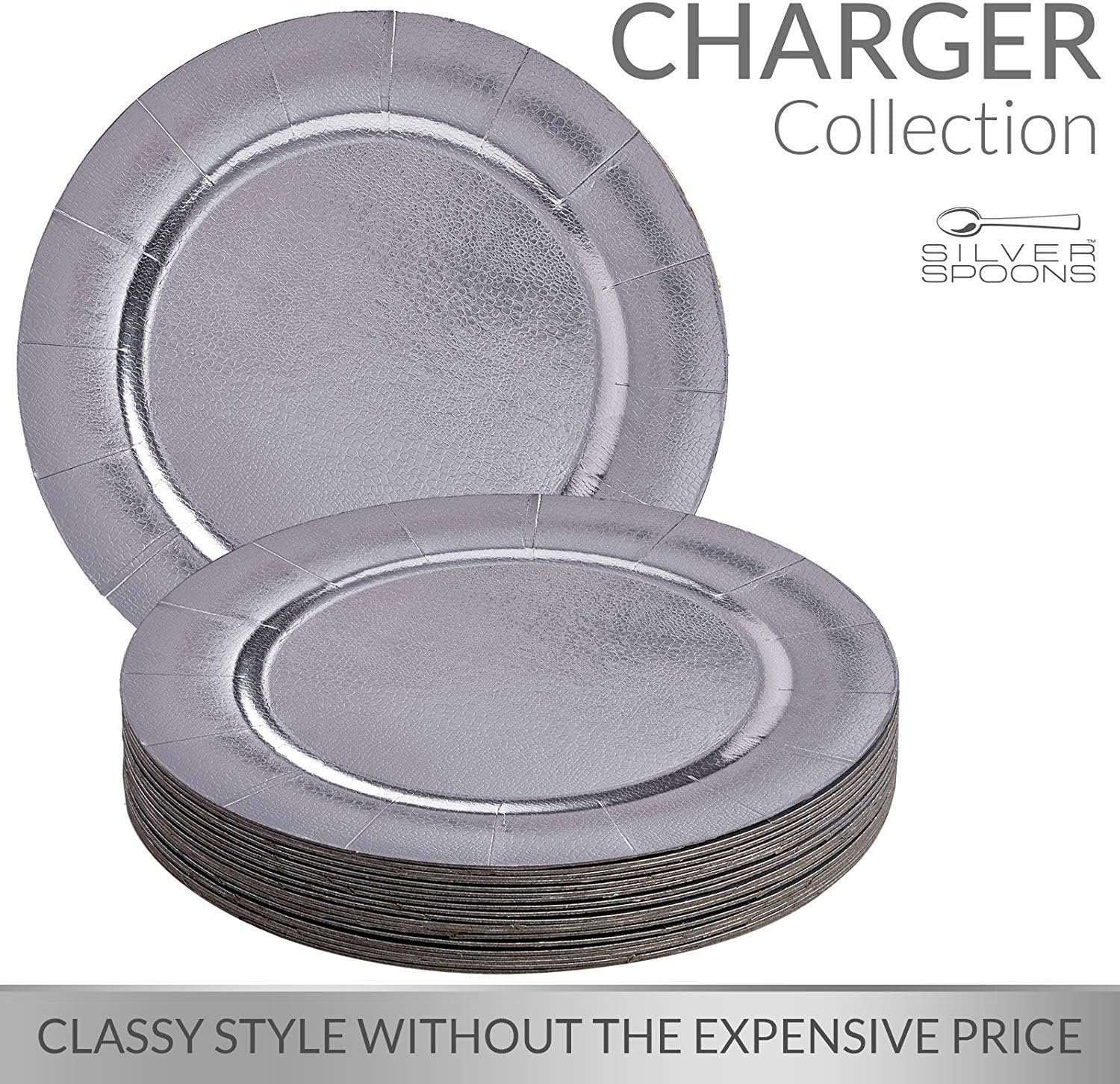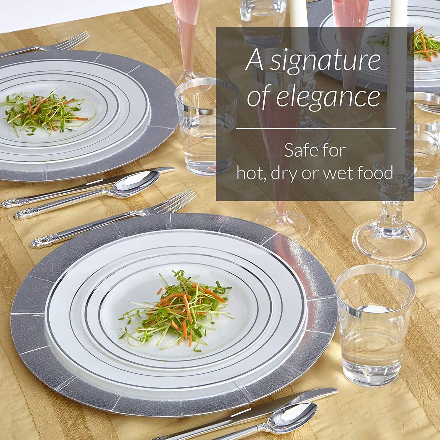 - EXQUISITE DESIGN: These attractive disposable chargers are designed with metallic finish, wide rims with a touch of class and elegant accent. The wide rims also prevent spills and the fine design makes this a perfect product to complement any color scheme or party decorations