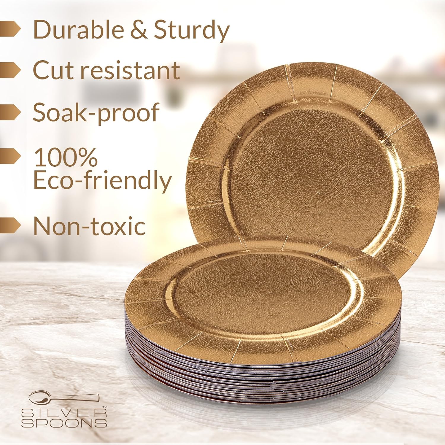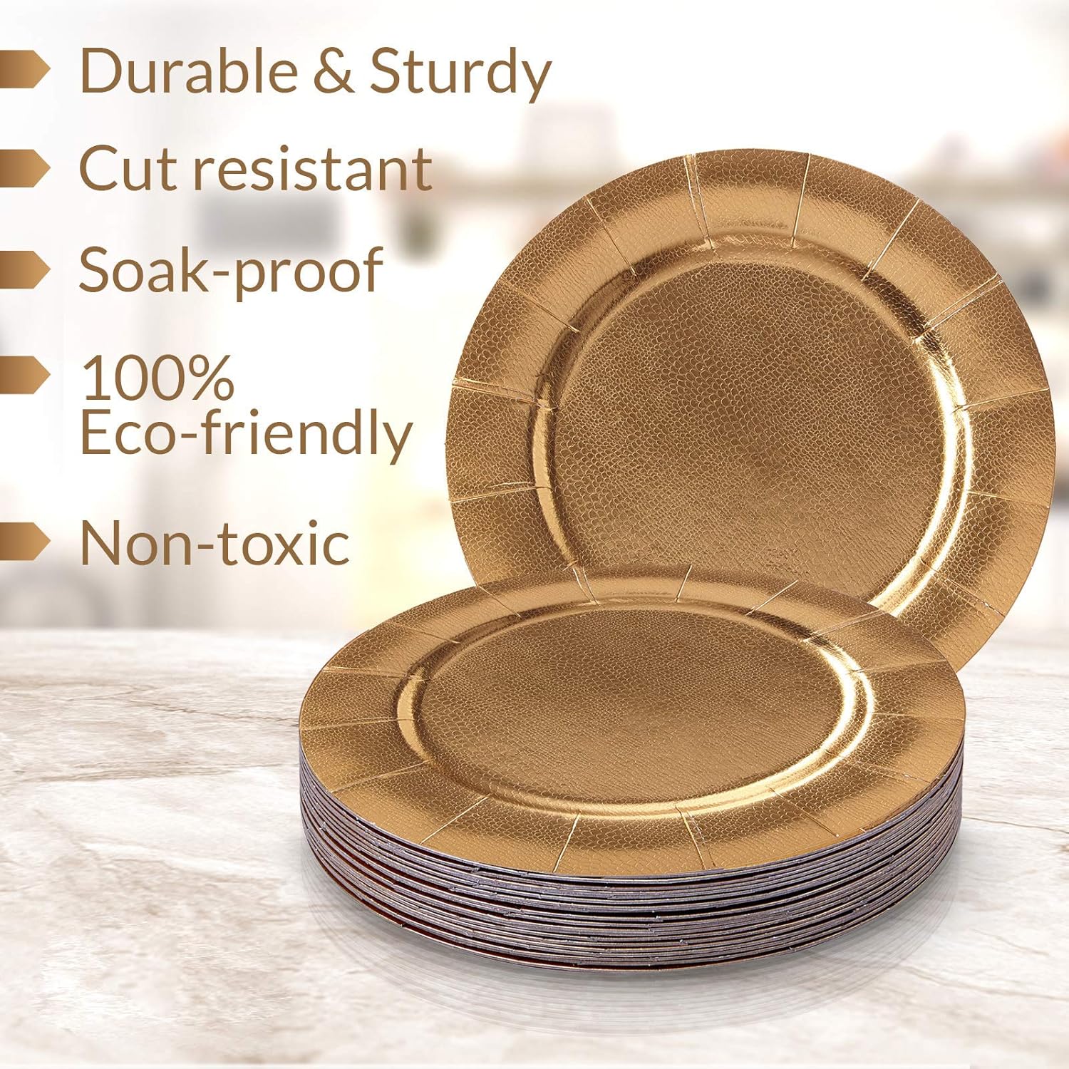 - PREMIUM QUALITY: These beautiful chargers are composed of high-rated heavyweight paper materials rendering the plates sturdy and durable. These disposable dinner chargers are and non-toxic and safe to use