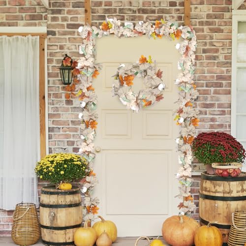 Fall Garland with Pumpkins and Berries ? 6ft Artificial Maple Leaf Garland with Cream and Orange Leaves for Thanksgiving, Fireplace, Front Door, Farmhouse Autumn Decorations