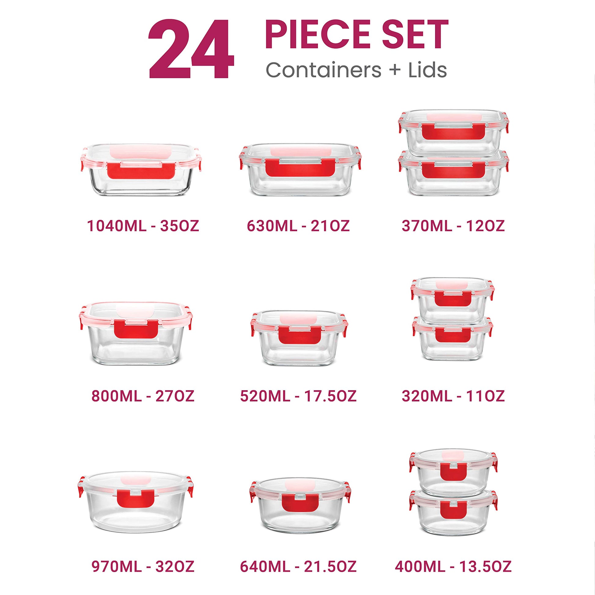 FineDine 24 Piece Glass Storage Containers with Lids - Leak Proof, Dishwasher Safe Glass Food Storage Containers for Meal Prep or Leftovers (Red, 24 Piece)