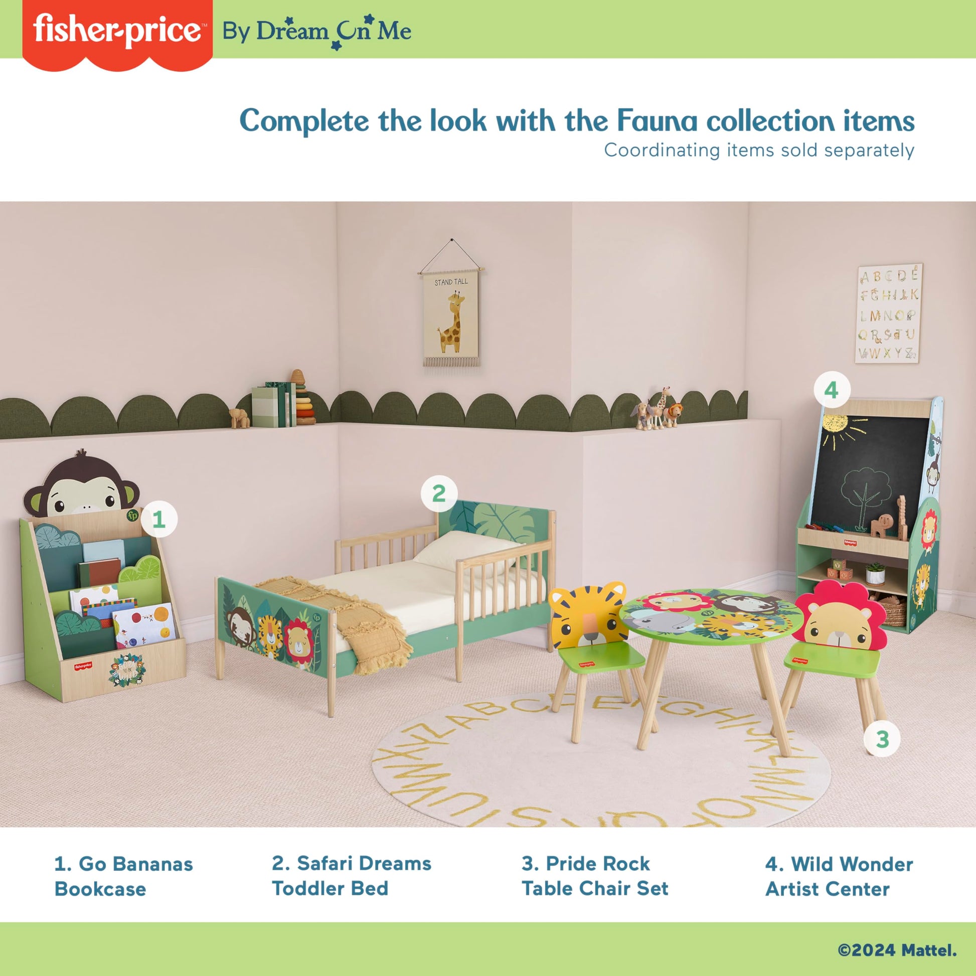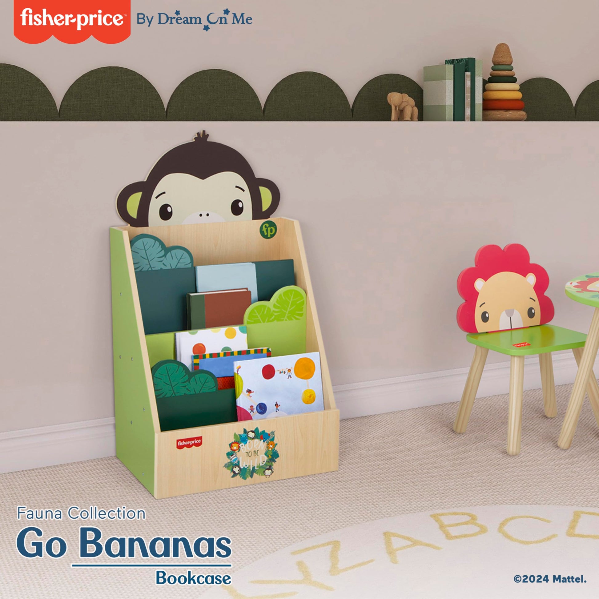Details: Introducing the Fisher Price Fauna Collection Go Bananas Bookcase by Dream On Me - Where reading takes on a wild twist! Inspired by the vibrant energy of the jungle, this delightful bookcase adds a touch of whimsy and functionality to any child's bedroom or playroom. Safety is our top priority, which is why the Go Bananas Bookcase meets ASTM standards, guaranteeing peace of mind for parents and endless enjoyment for little bookworms. Keep your child's favorite stories organized and easily accessible! With two to four shelves arranged in descending order, little readers can arrange their books by size or theme, making it a breeze to find their next adventure. Crafted with durability in mind, the Go Bananas Bookcase is designed to withstand the demands of active little ones. Available in a playful jungle print design, this bookcase inspires children to embark on exciting literary adventures. Product dimensions are 19.06” L x 13.15” W x 34.13” H.