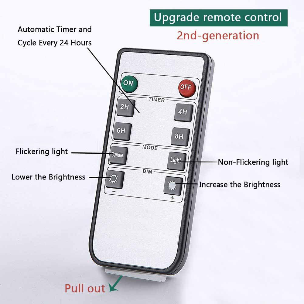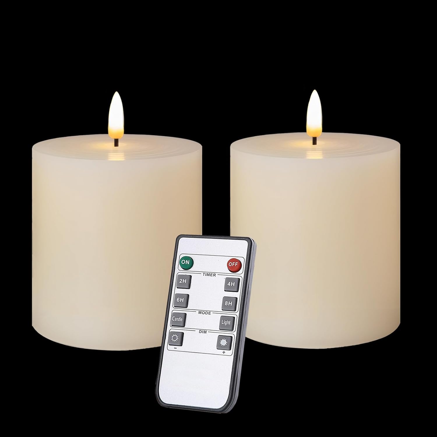 - ♥REMOTE CONTROL WITH TIMERS lets you turn the 3X3 ivory flameless candles on or off without getting up.Timer feature lets you schedule your candles in 2-, 4-, 6- and 8-hour increments, cycling every 24 hours.The brightness of the candle can also be adjusted.