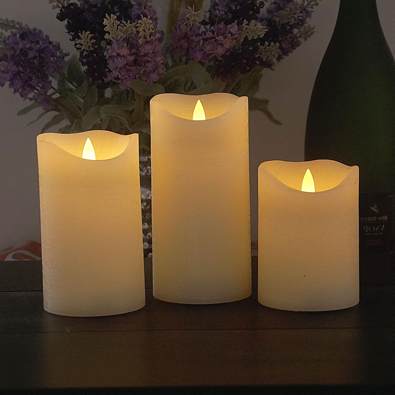 - Realistic real wax flameless candles. These LED pillar candles are made of real wax with natural rustic texture. Although they are battery operated fake candles, these flameless pillars look like and flicker like real candles. The bright and soft glowing candle lights create warm and romantic atmosphere. The traditional rustic texture design makes these candles classic and elegant.