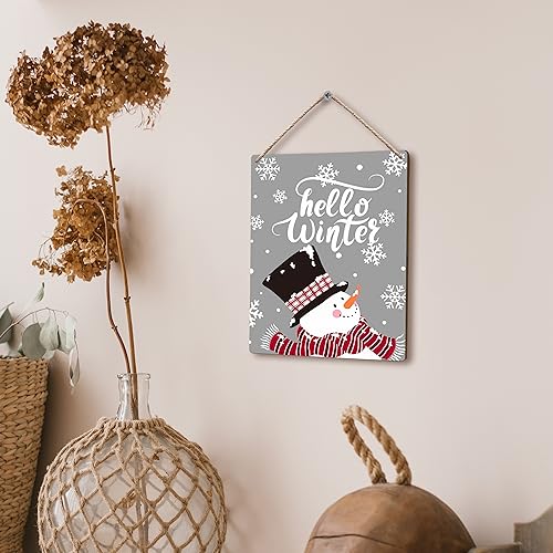 FUGWN Hello Winter Snowman Snowflake Christmas Hanging Wooden Signs 8x10, Winter Decorations for Home, Xmas Wall Decor