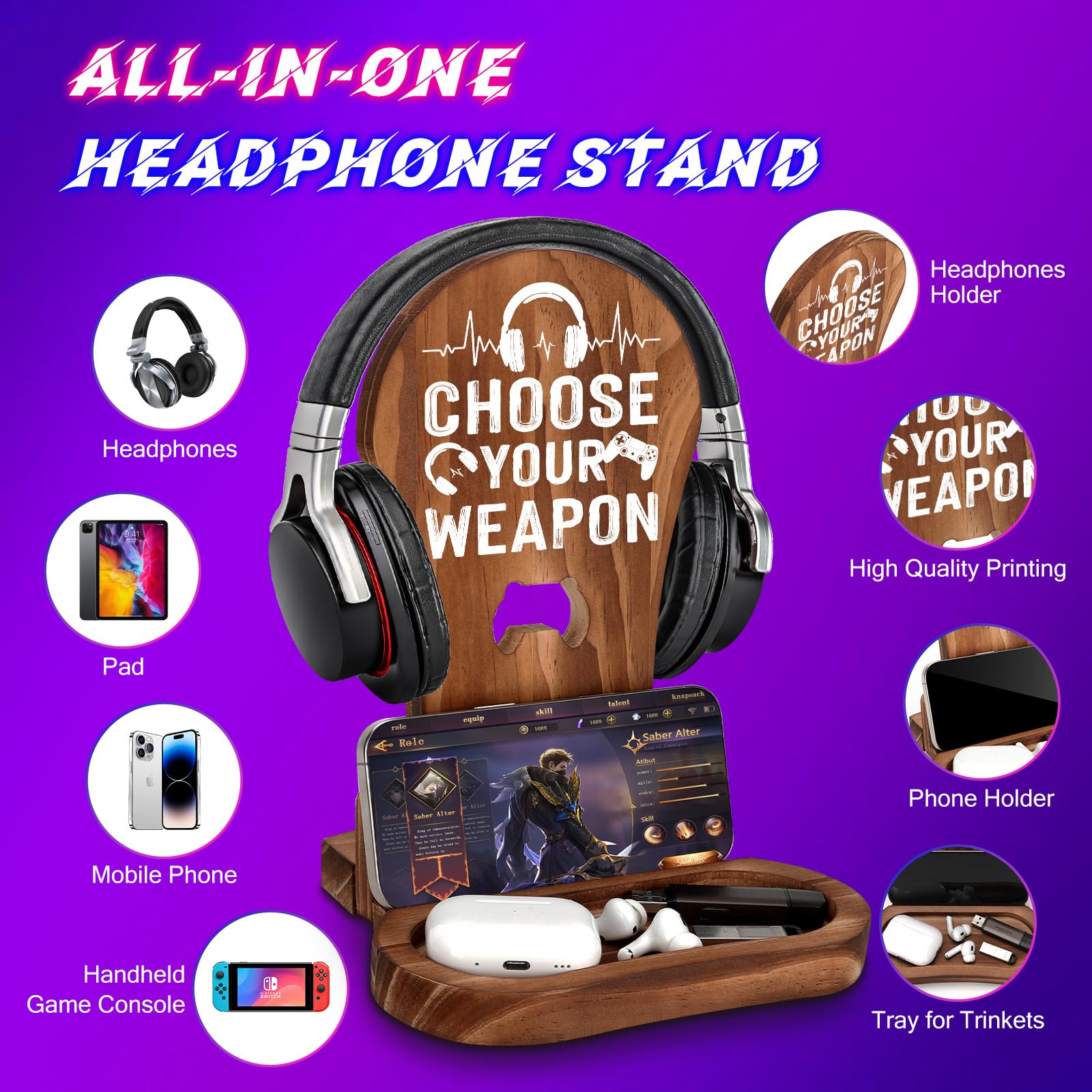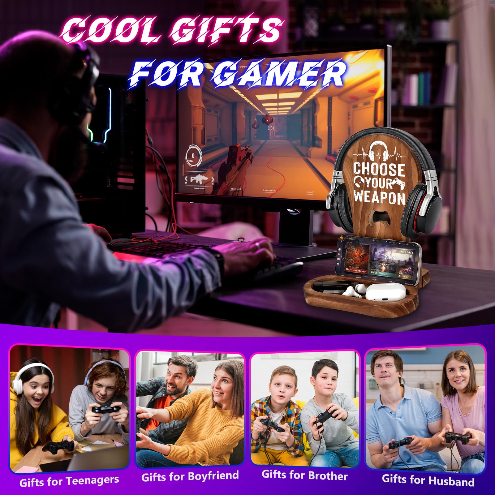 Gamer Gifts for Teenage Boys, Gaming Christmas Birthday Gifts for Men Son Boyfriend Husband Game Lover, Gamer Room Decor for Man, Wood Headset Stand for Gaming Desk Decor -Choose Your Weapon