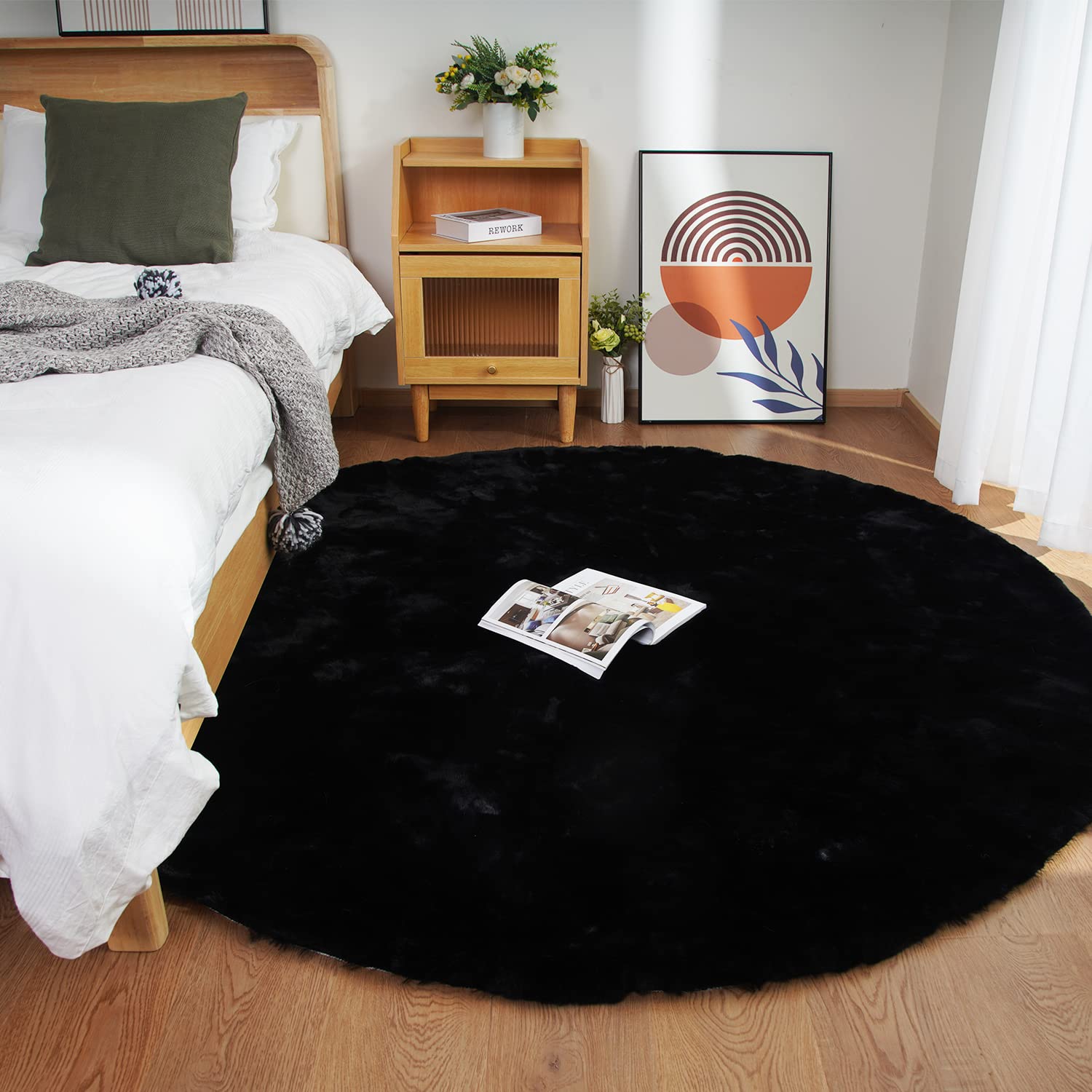 Ghouse Faux Rabbit Fur Round Rug 4ft Black Round Rugs for Bedroom Decor Fluffy Area Rugs for Living Room, no-Shedding Carpet Sheepskin Washable Rug Rome Decor