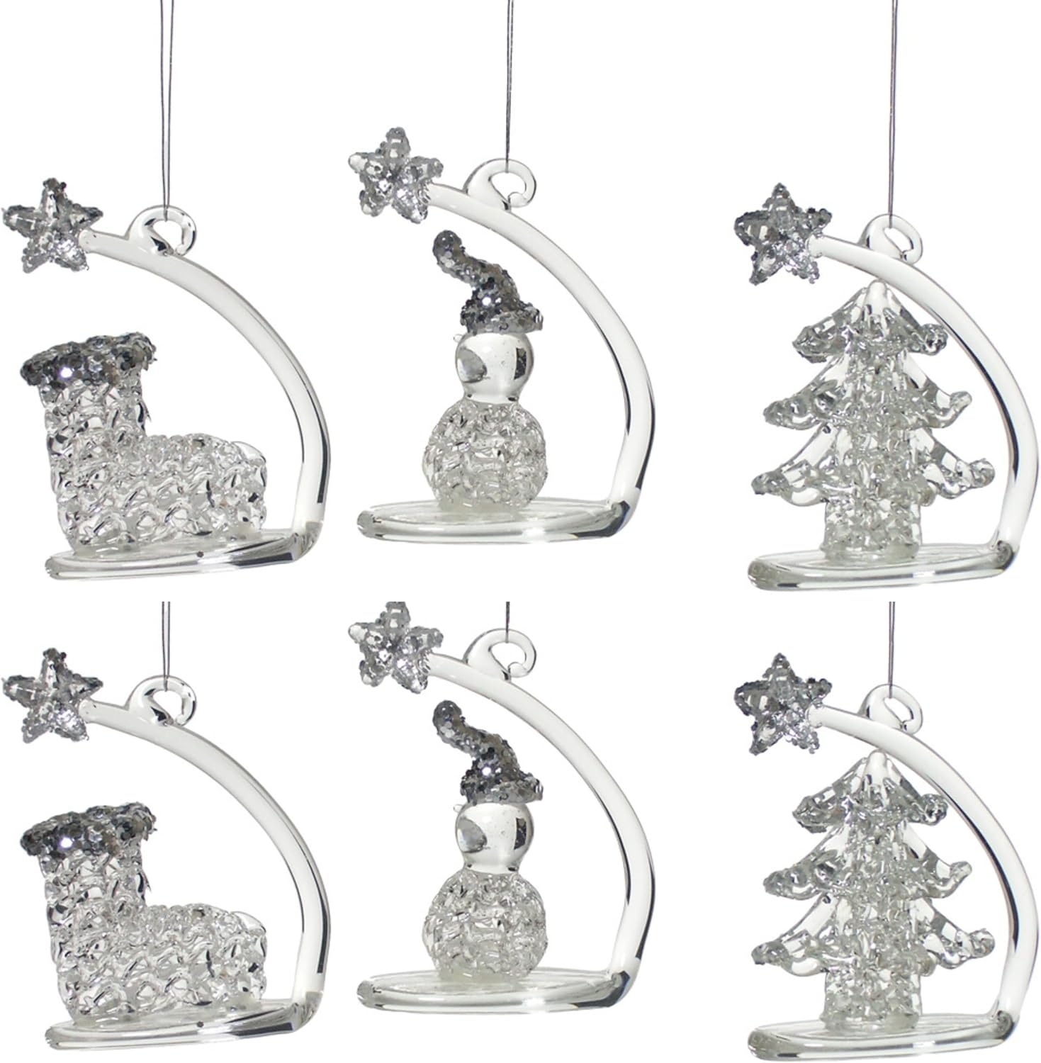 - Glass ornaments. A set of 3 spun glass ornaments featuring a snowman, a boot, and a Christmas tree. Each one has a star over the top of the figure. The ornaments measure 2.25"H x 1.75"W.