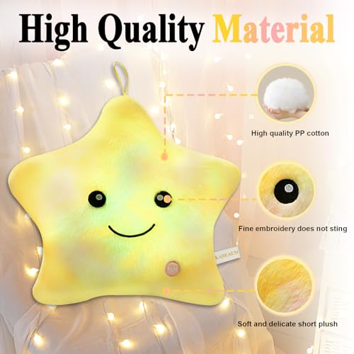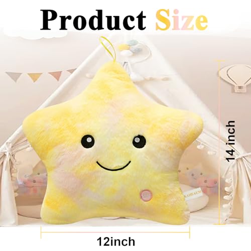 - ?¡¼LED LIGHT UP PILLOW?¡½:When you press the bottom on/off button,this glow pillow can glow.During the process,the light will automatically change the colors.The glow is very soft,not hurt the eyes.When children separate with their parents at their own room,there is some fear and loneliness at night,our LED star pillow is the best choice to accompany children at night.Light up plush star yellow star stuffed animal,nightlight stuffed animal,star stuffed toy christmas stuffed animals bulk