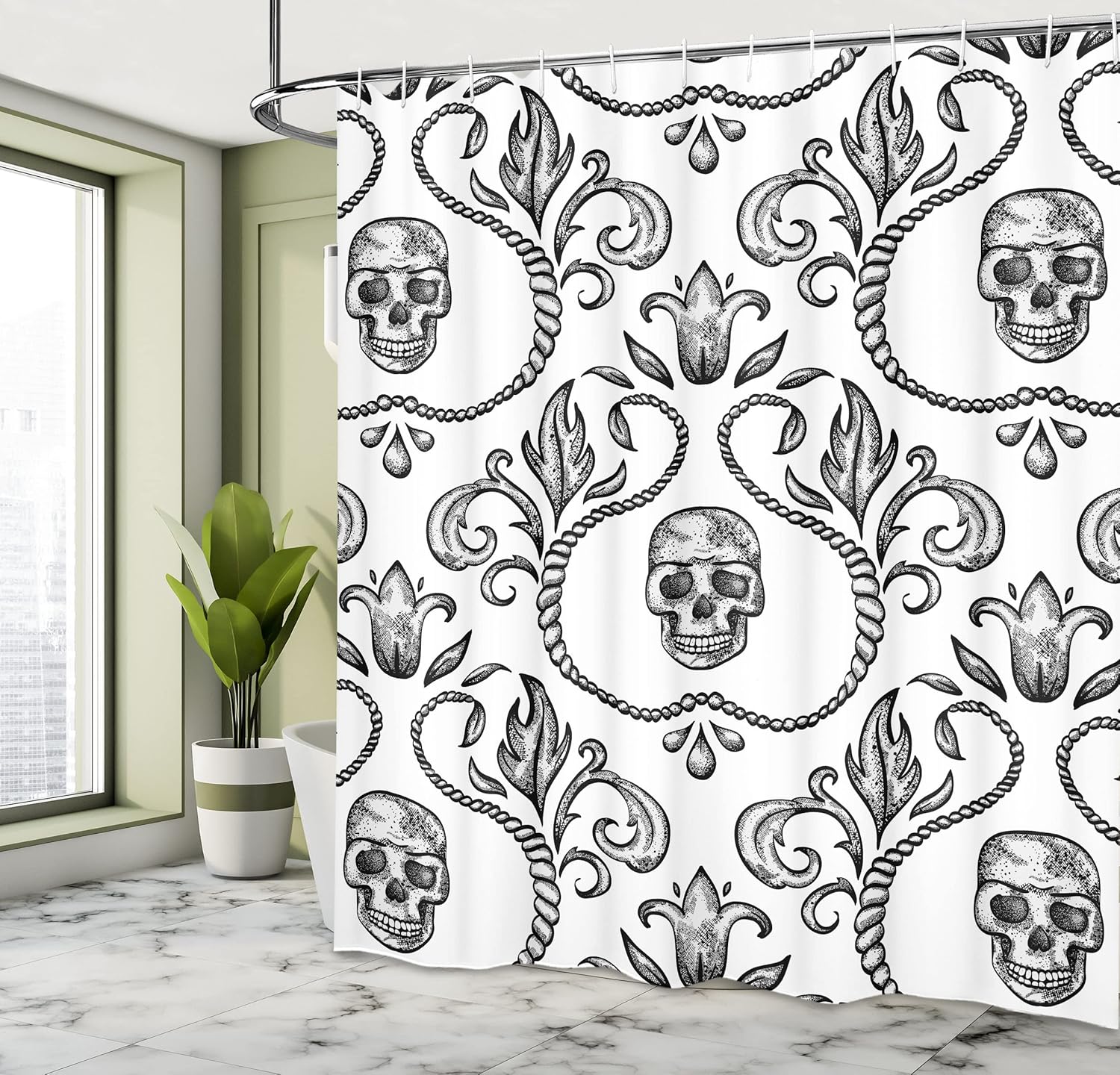 Gothic Skull Shower Curtain - Baroque Floral Design, 69" x 70", Bathroom Decor Set