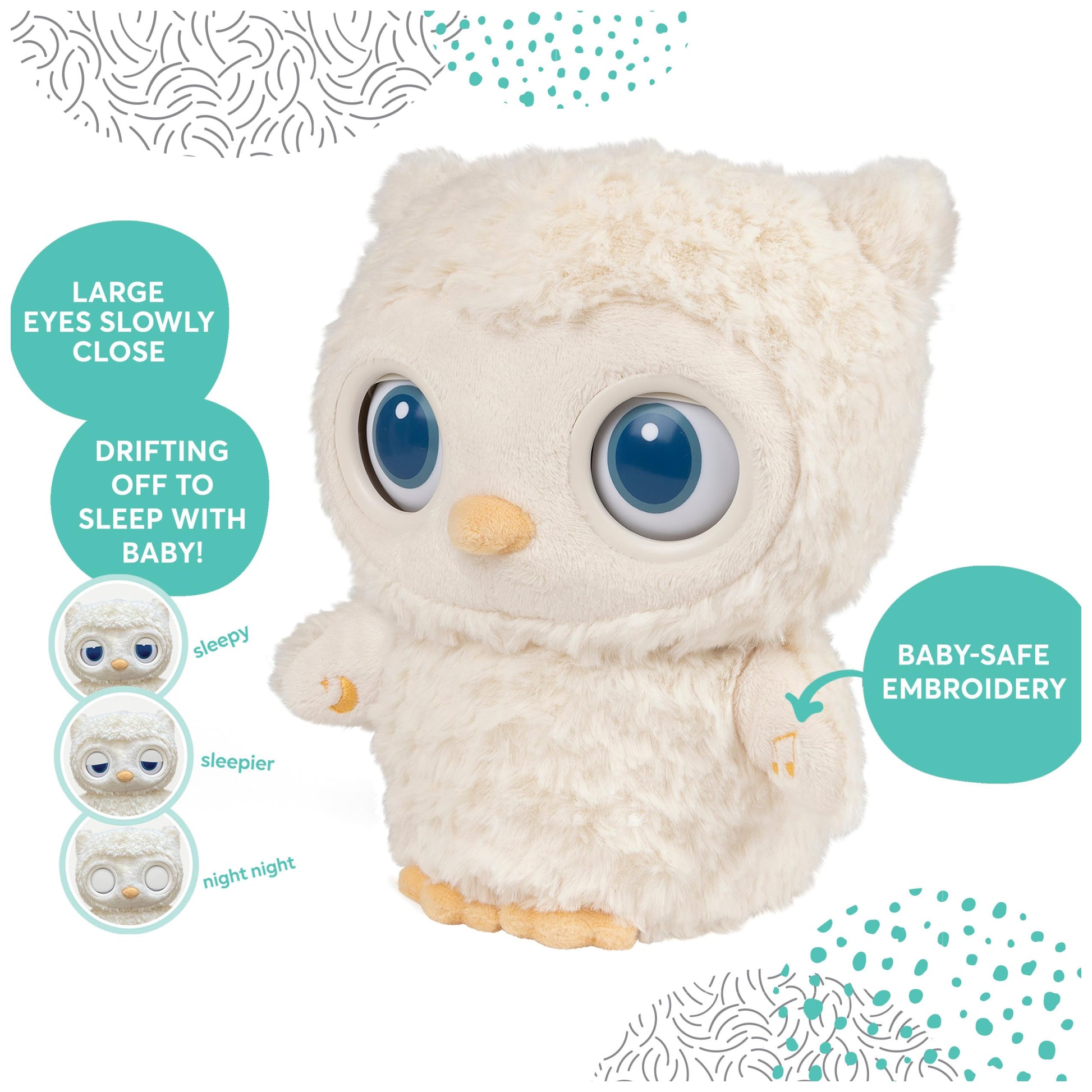 - SLEEPY OWL SOOTHER: This soft, cuddly owl features sleepy eyes, 7 soothing sounds, tranquil melodies and gentle LEDs to relax baby. The plush owl can barely keep its big, round eyes open as they droop and close to the soothing sounds and music