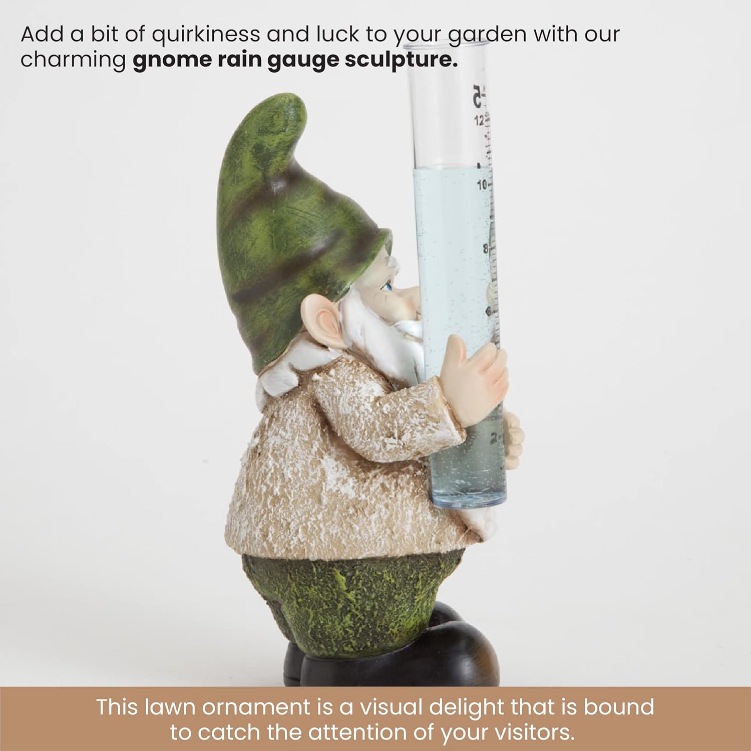 - GARDEN DECORATION Add a touch to your garden with our charming gnome rain gauge sculpture. This lawn ornament is a visual treat that will attract the attention of your friends and family.