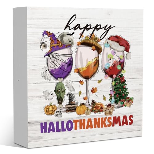 Happy Hallothanksmas Wood Decor Fall Halloween Thanksgiving Christmas Wine Decorations Gifts for Women Men Harvest Autumn Wood Decorations Sign for Home Farmhouse Office Desk Shelf 5 x 5 Inches